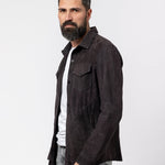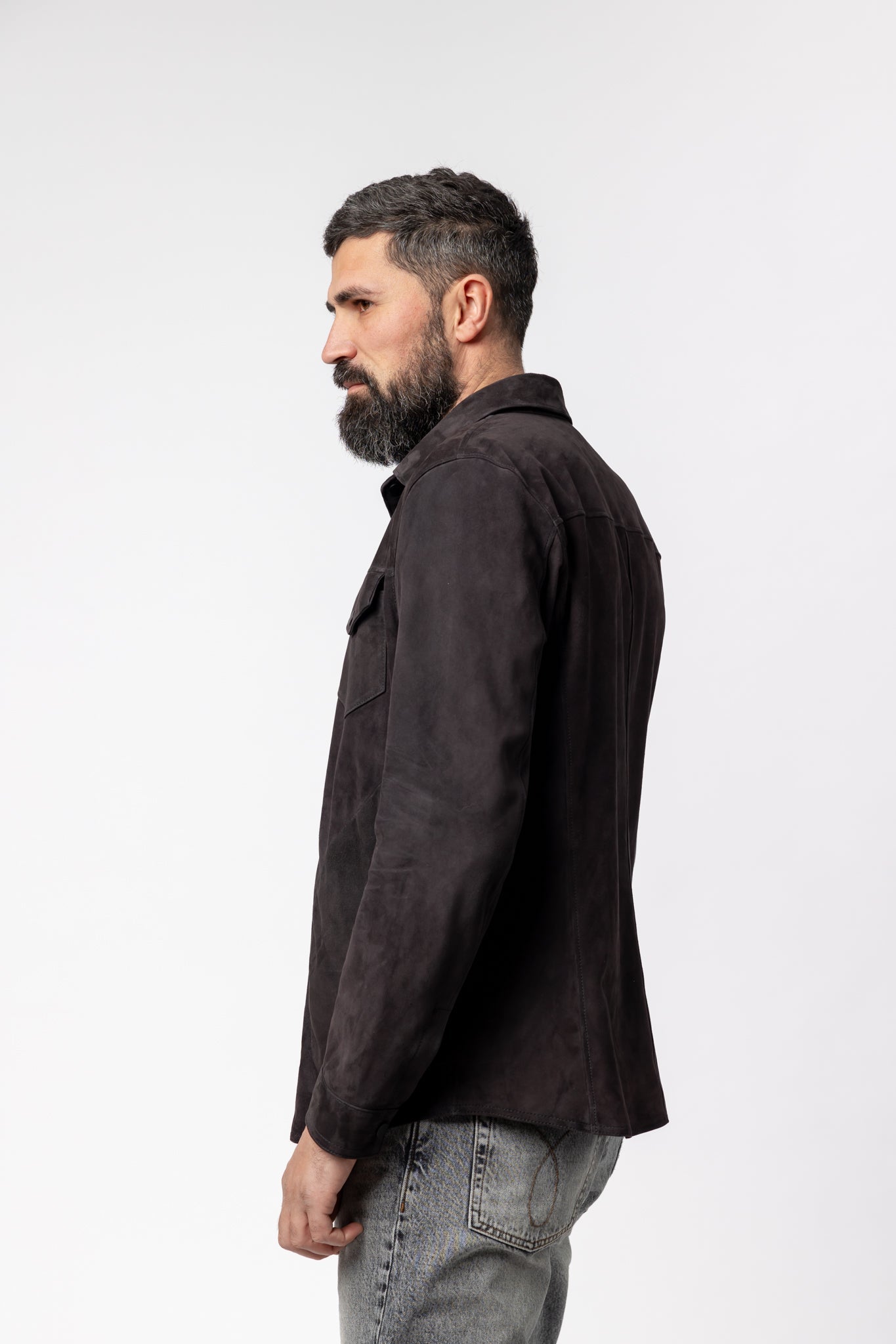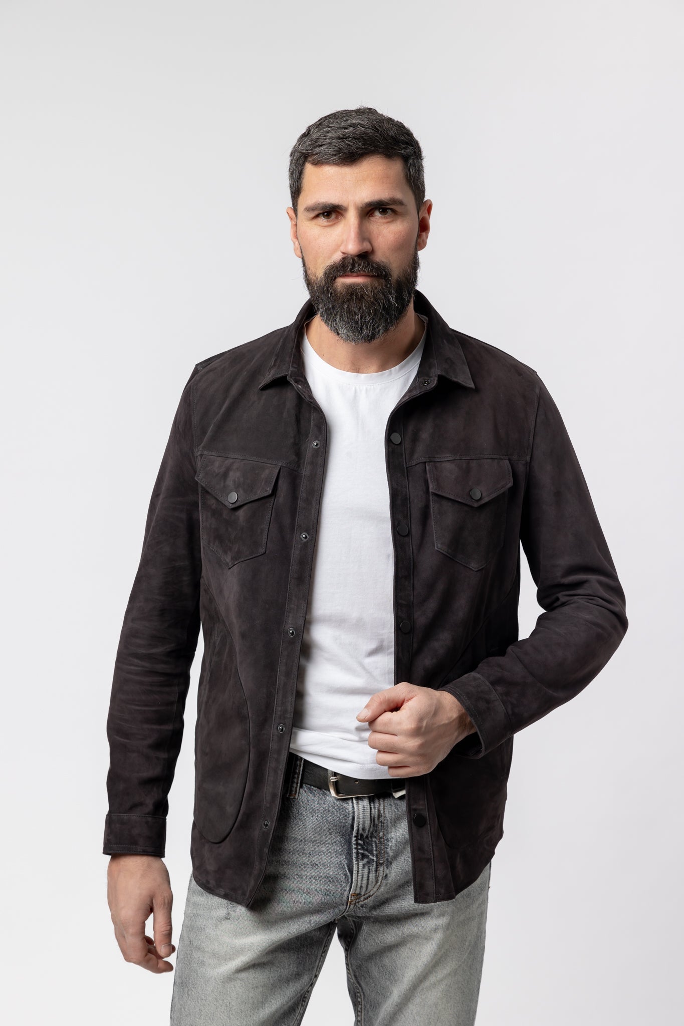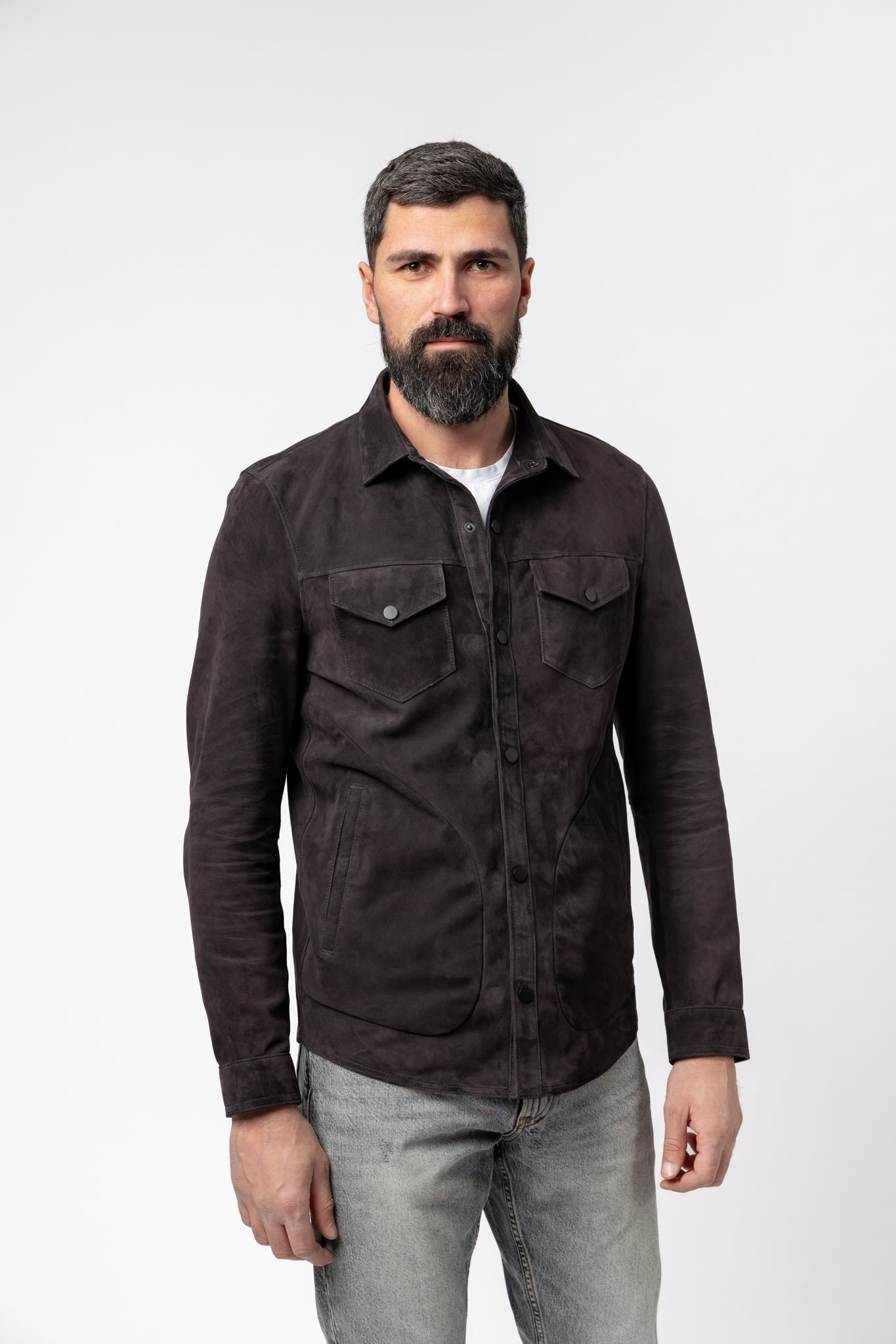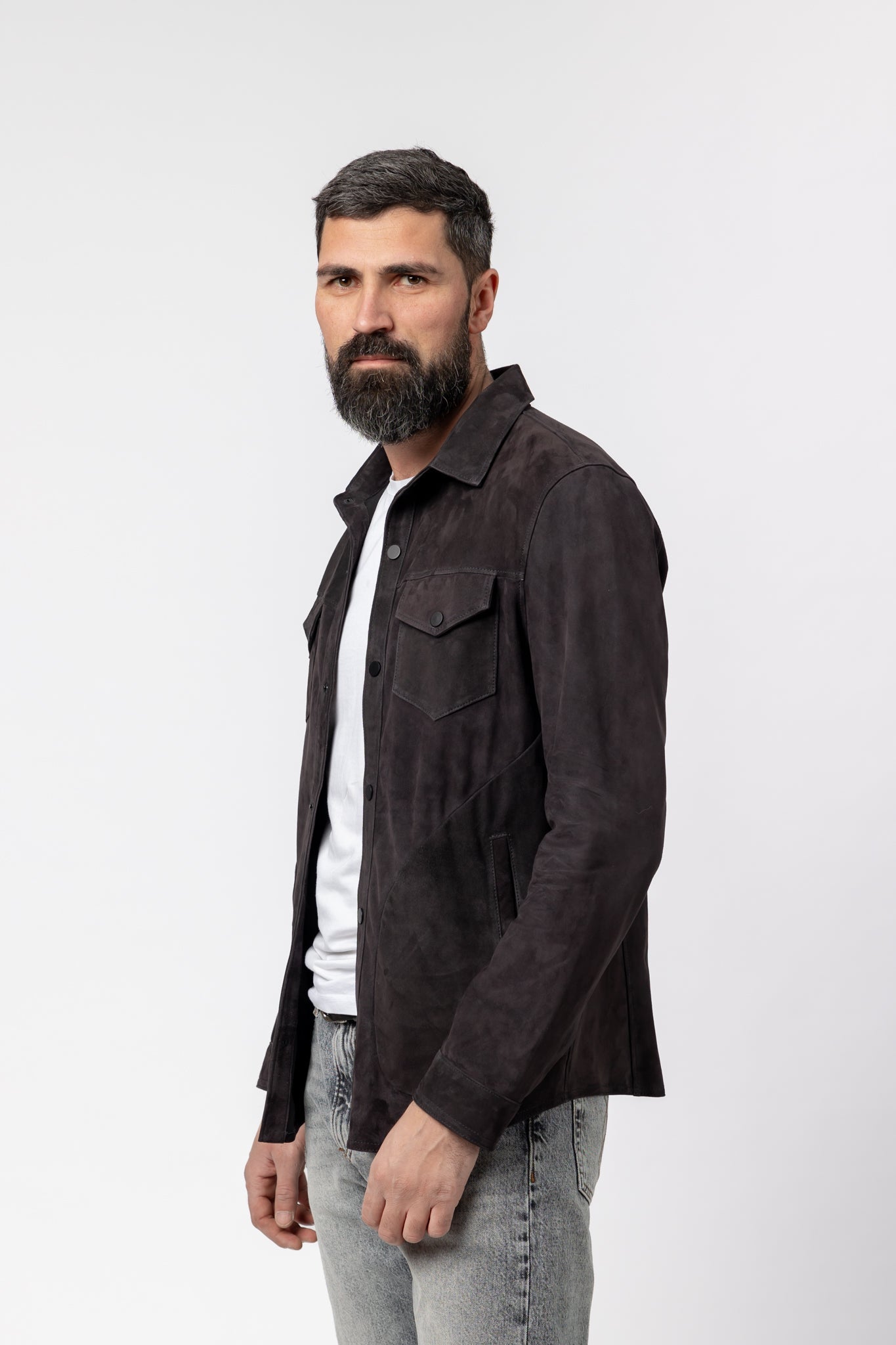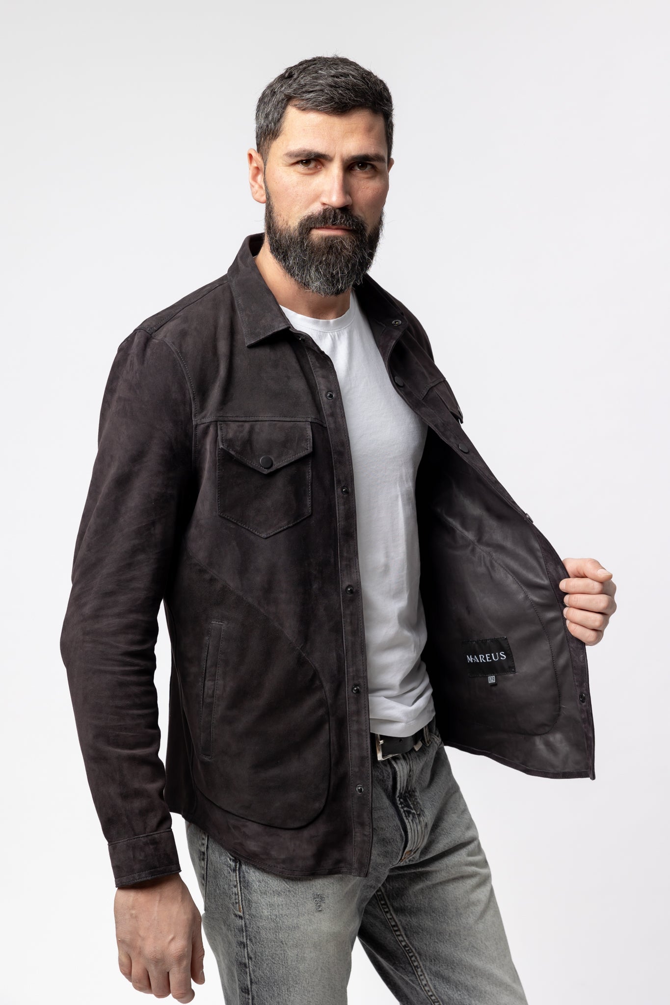 Geacă din Piele Întoarsă Naturală, Stil Cămașă, Bărbați, Graphite 108