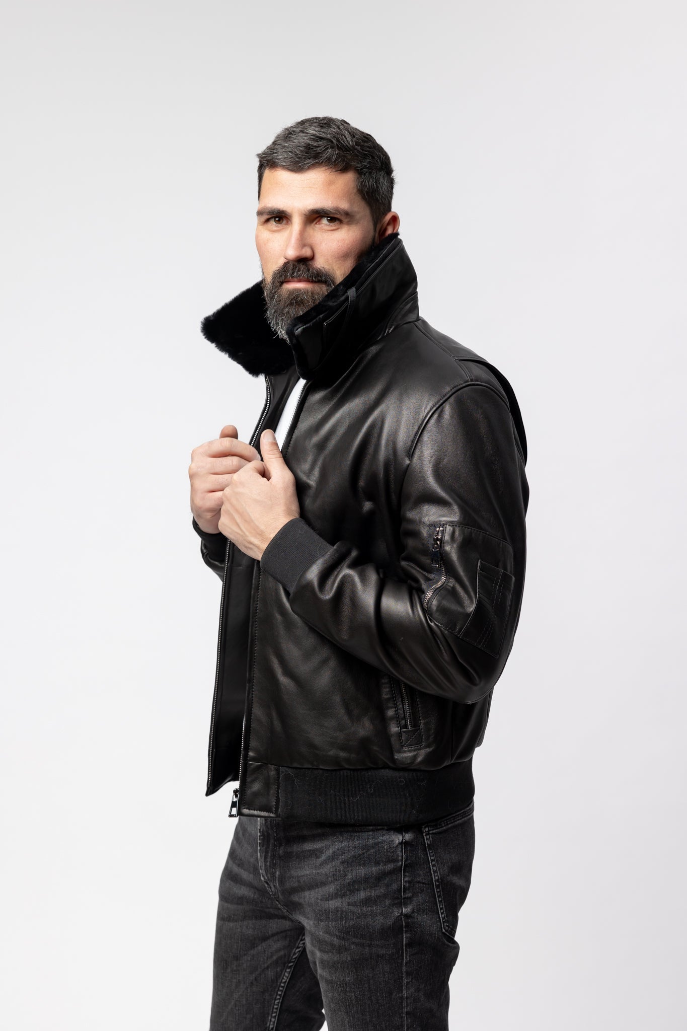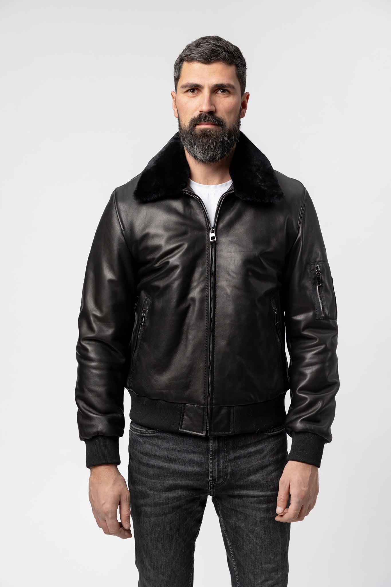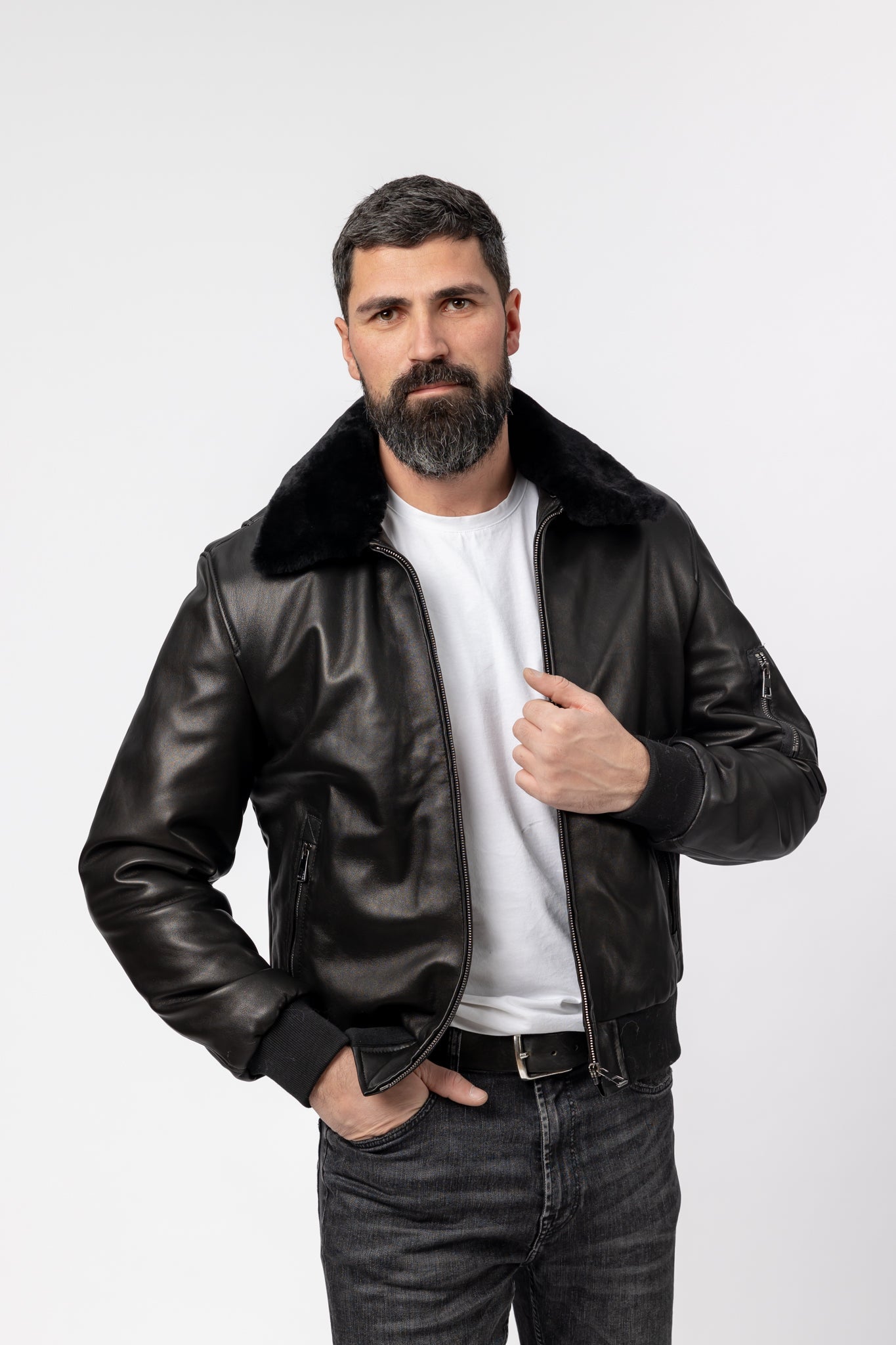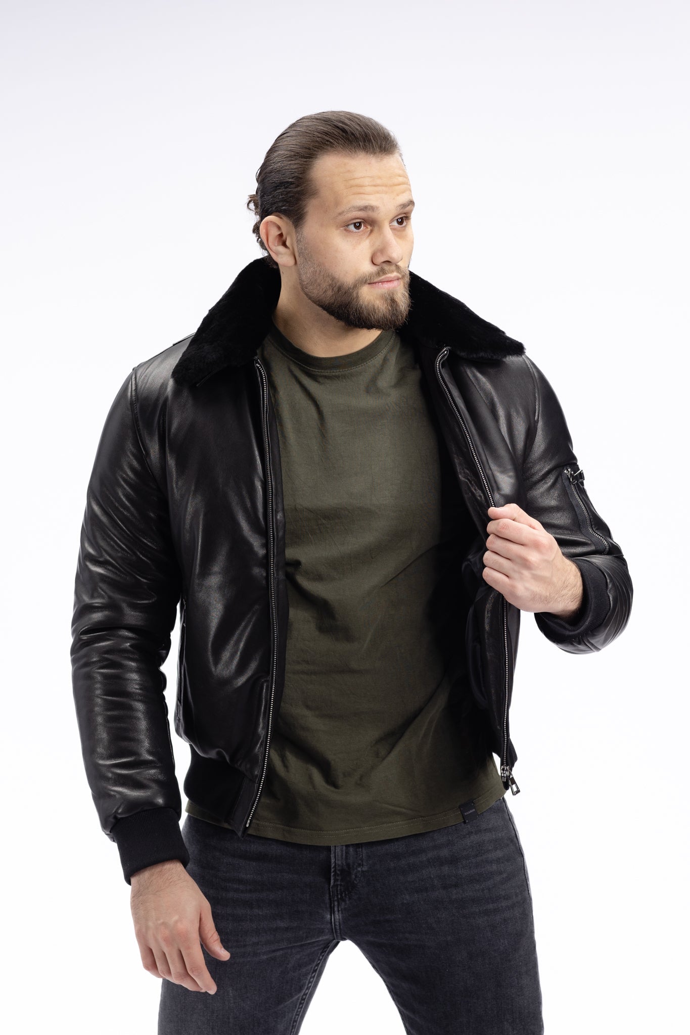 Geacă din Piele Naturală cu Blană, Bărbați, Obsidian 115