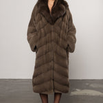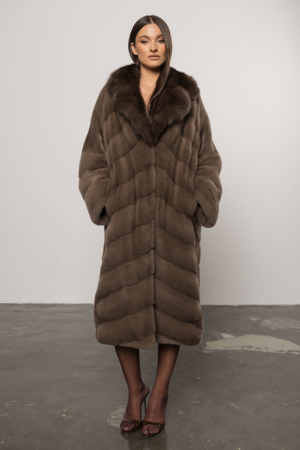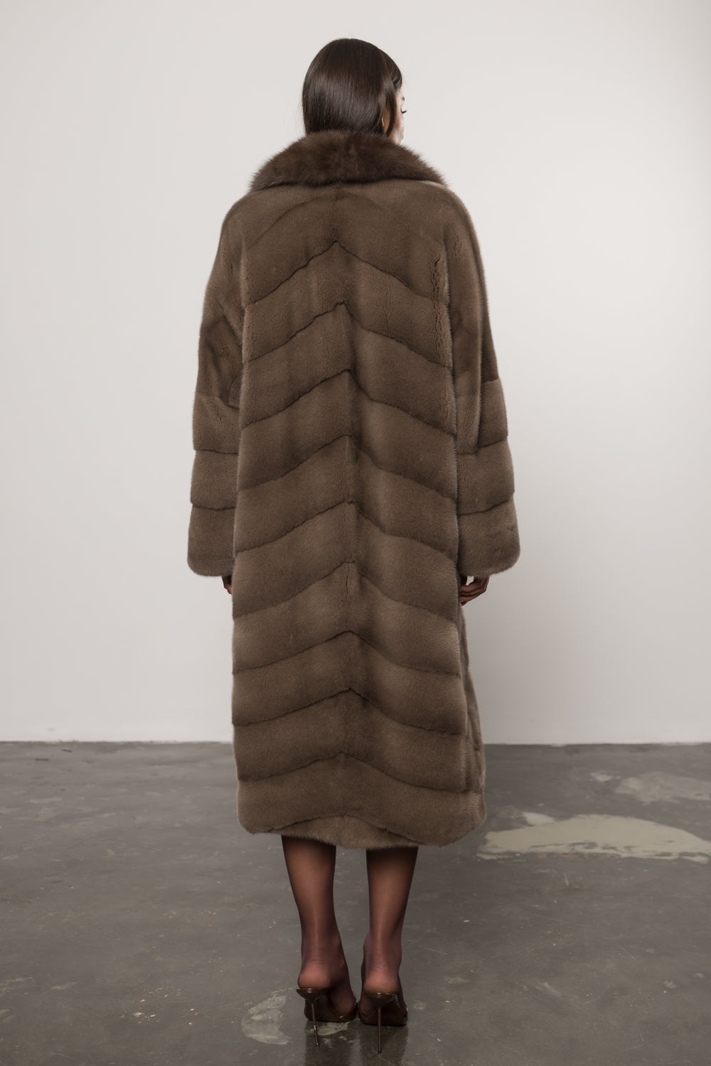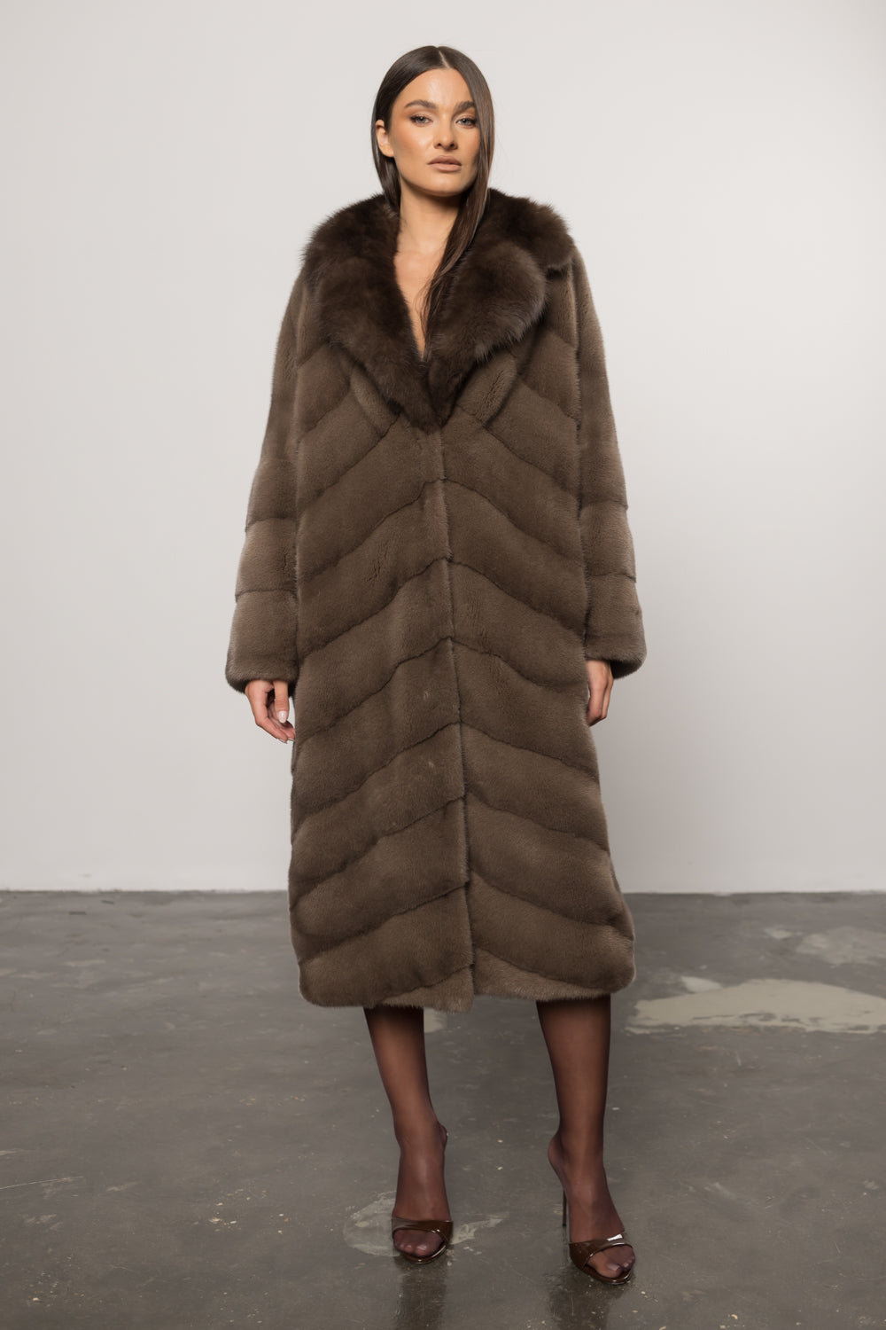 Natural mink fur coat with sable collar, in the sophisticated shade of Taupe Sable, one of the rarest and most luxurious furs in the world. Its silky texture and subtle sheen turn this piece into a symbol of absolute elegance.