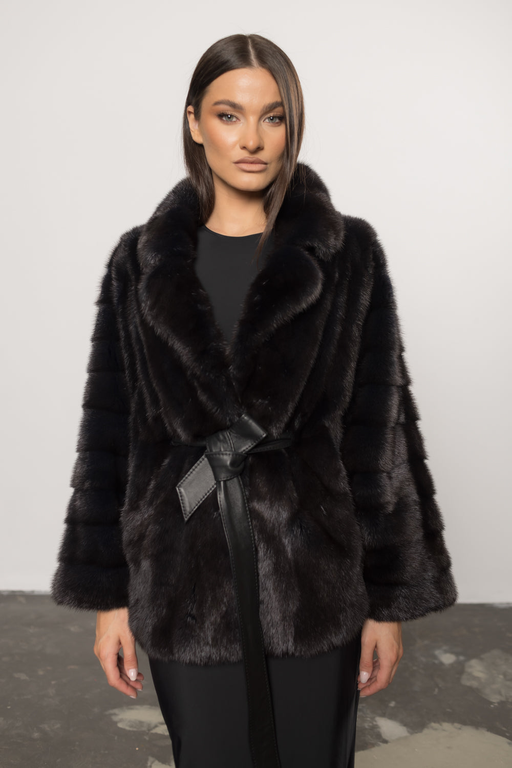 Haină din Blană Naturală de Vizon, Guler Rever, cu Cordon din Piele, Albastru Închis Închis 423