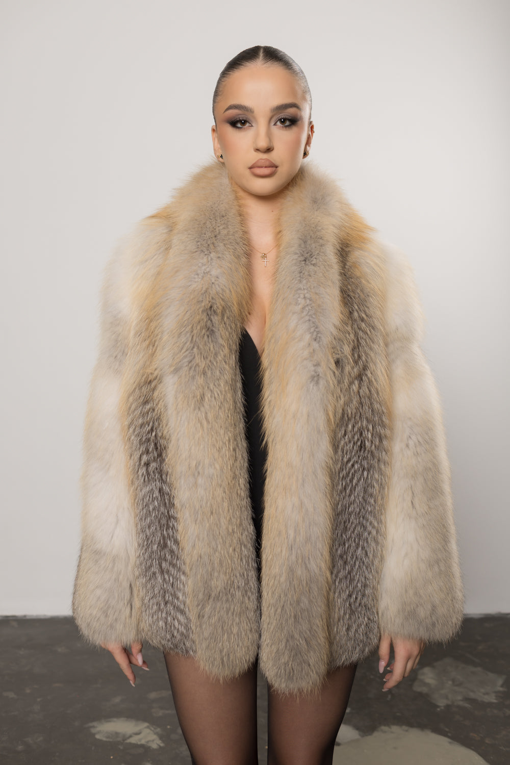 Haină din blană naturală de vulpe, cu guler tip rever șal amplu, creată pentru femeile care apreciază luxul autentic și eleganța atemporală. Blana de vulpe se remarcă prin volumul bogat, textura moale și reflexiile spectaculoase, iar în această variantă subliniază frumusețea nuanțelor naturale, calde și luminoase.