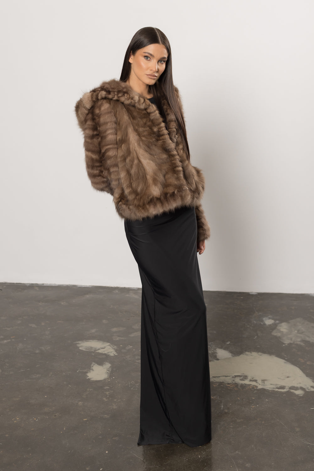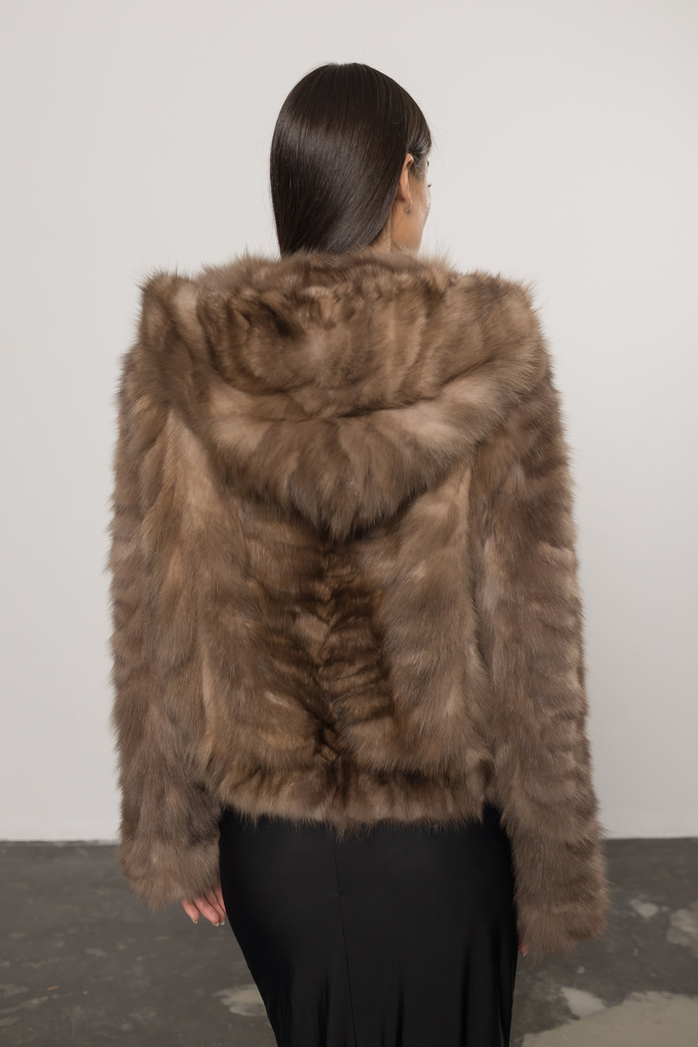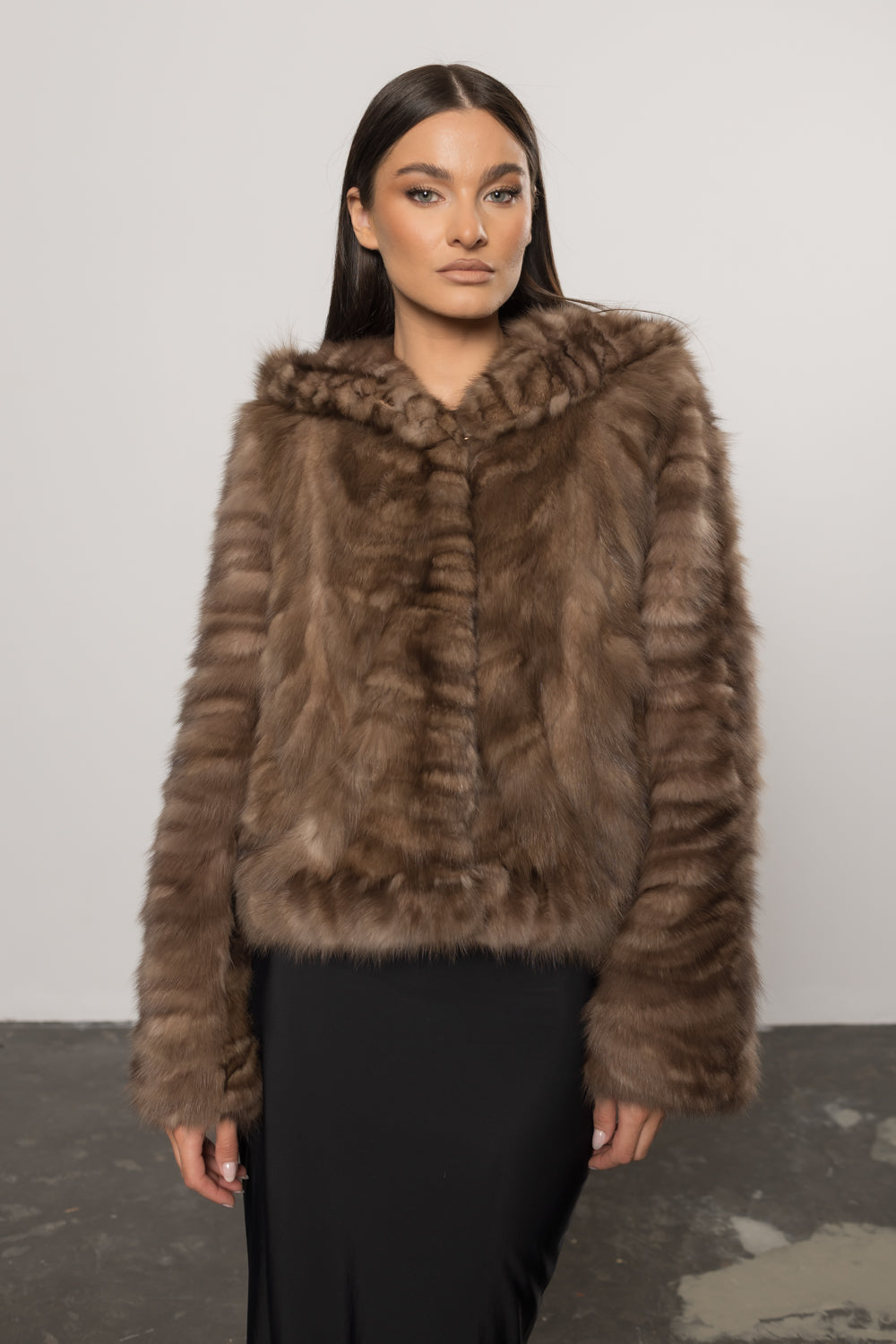 Haină din blană naturală de zibelină, cu glugă, creată pentru femeile care apreciază luxul autentic și rafinamentul absolut. Zibelina, considerată cea mai valoroasă blană din lume, se remarcă prin textura sa fină, strălucirea delicată și durabilitatea unică. Este o piesă exclusivistă, sinonimă cu prestigiul și eleganța atemporală.