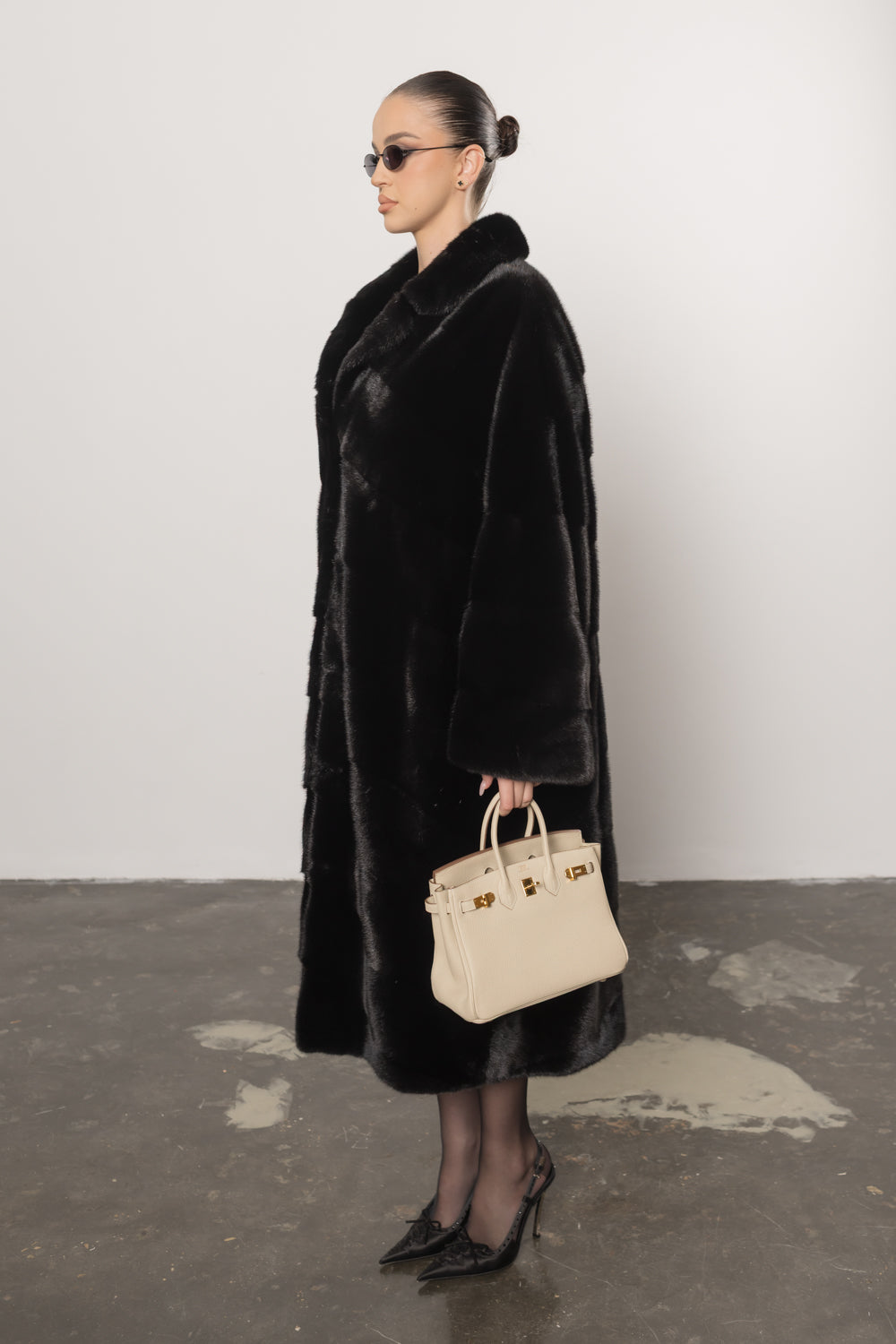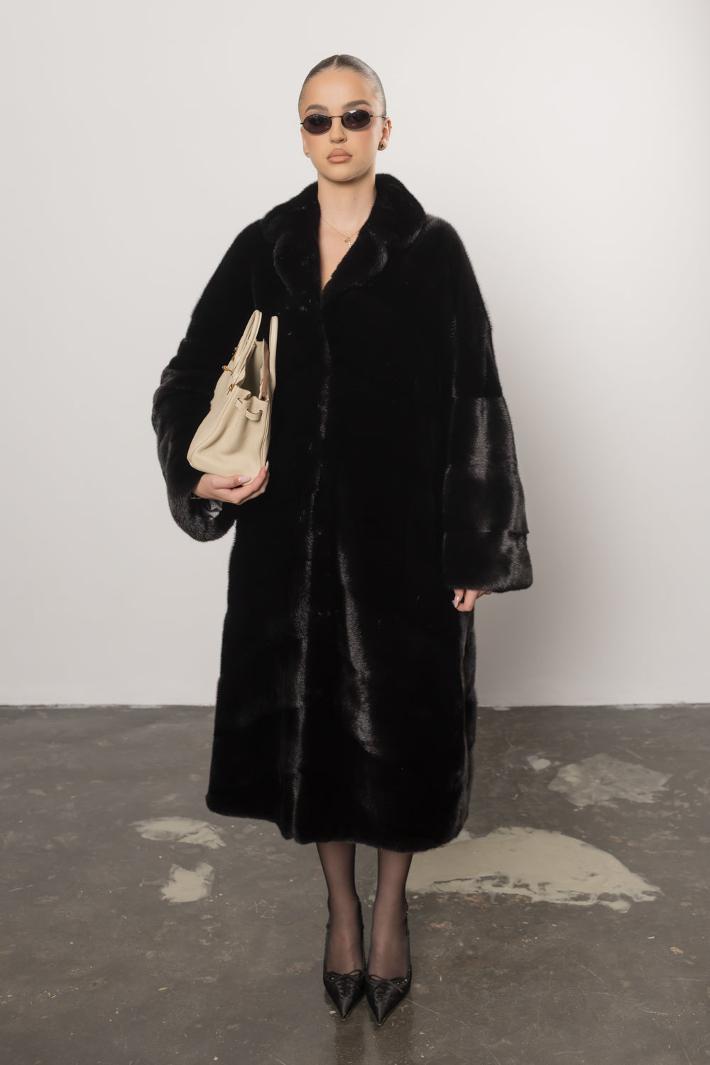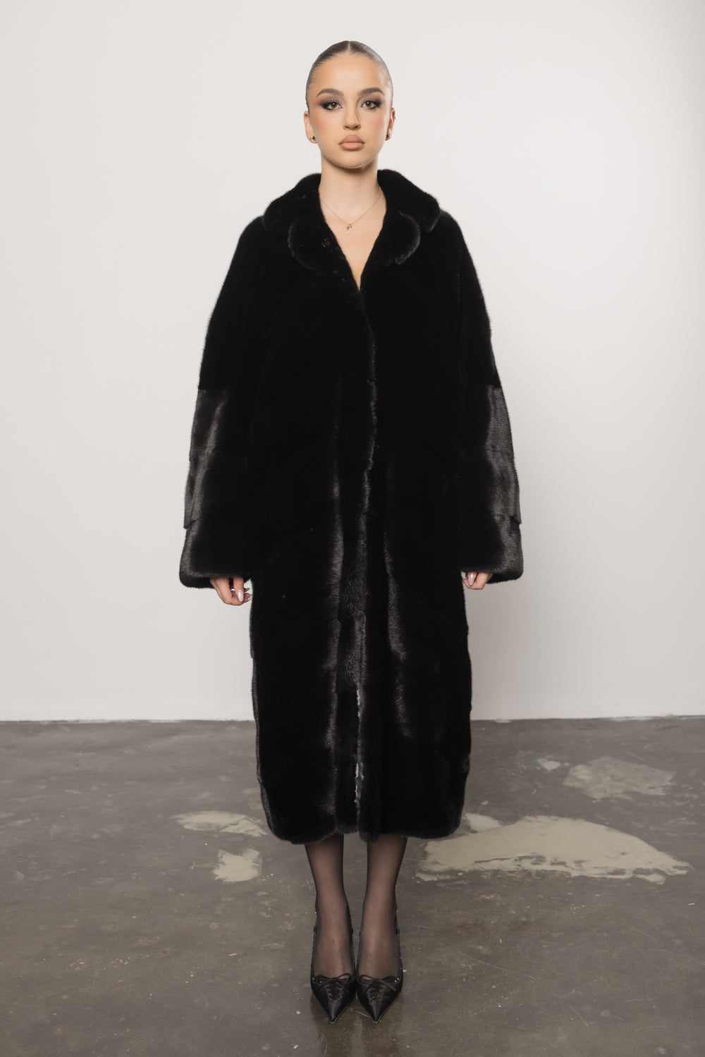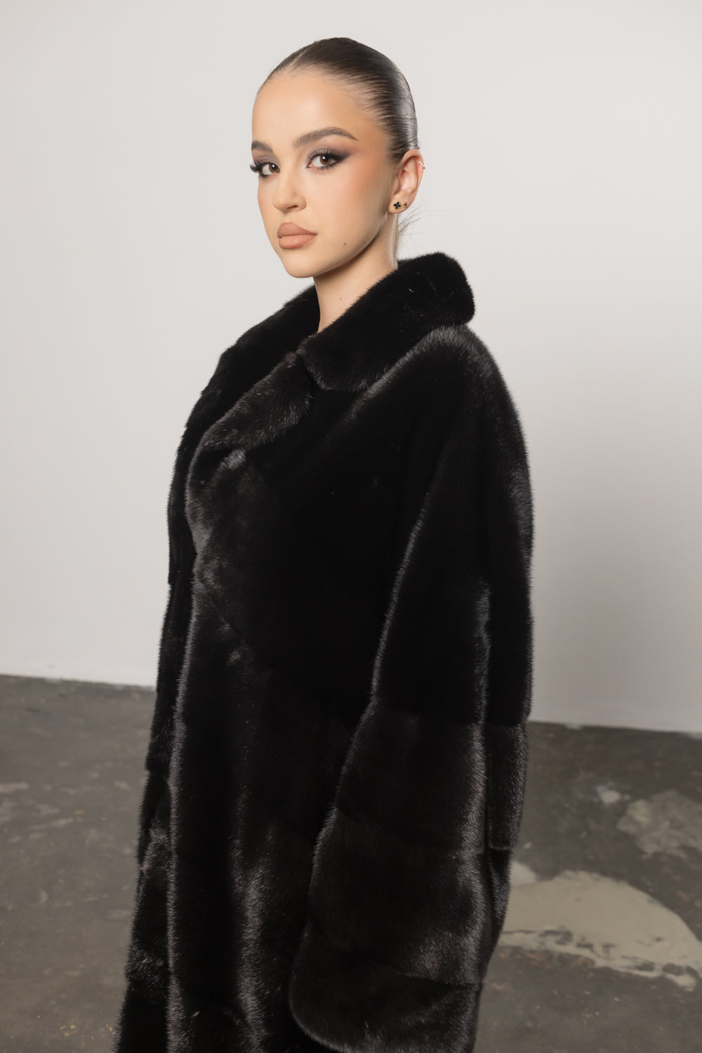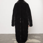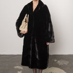 Palton din blană naturală de vizon în nuanța intensă Diamond Black, o piesă de lux impunătoare ce redefinește eleganța clasică printr-un design amplu și rafinat. Croiala sa lejeră este completată de gulerul rever elegant, care adaugă un plus de distincție și noblețe întregii siluete.