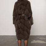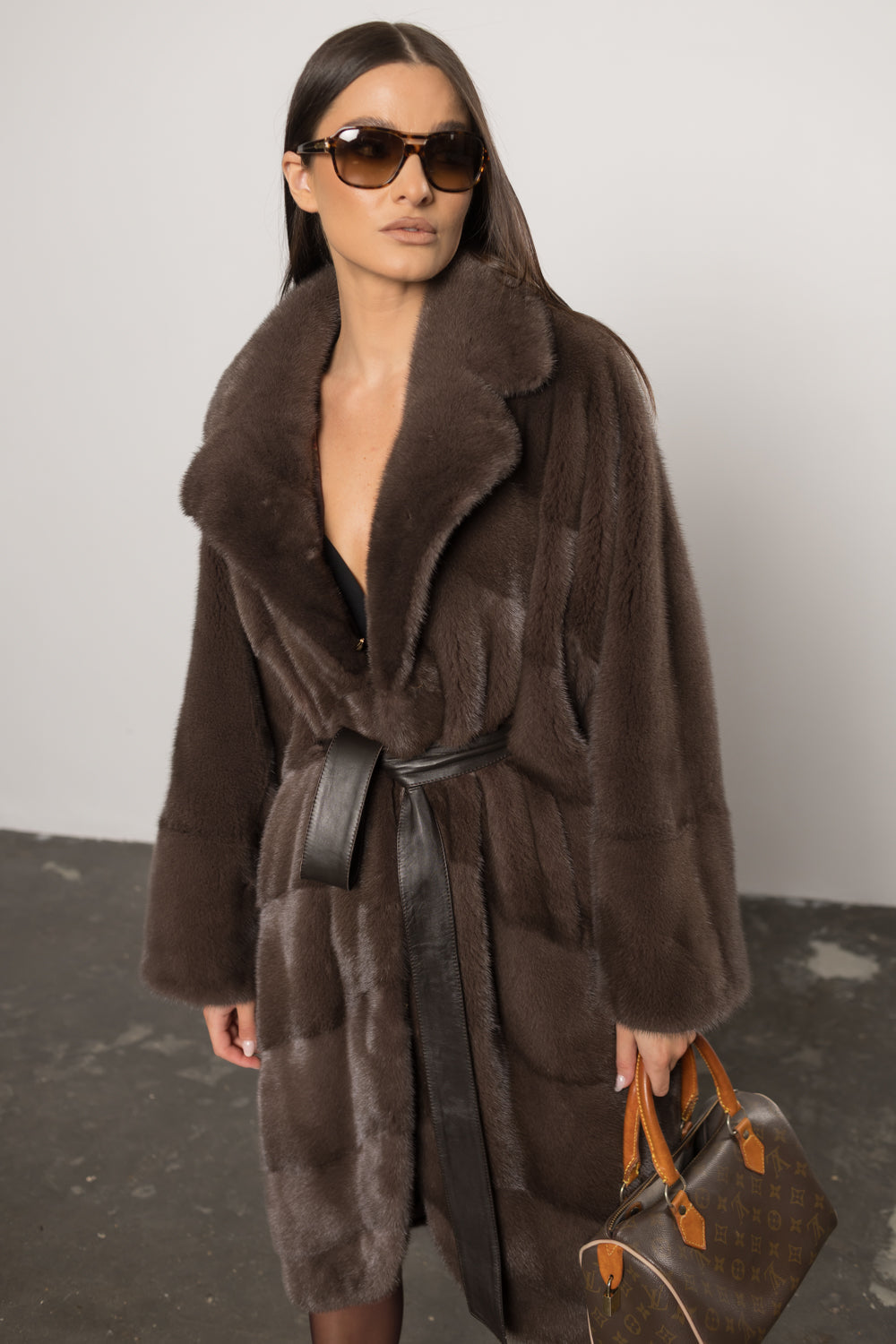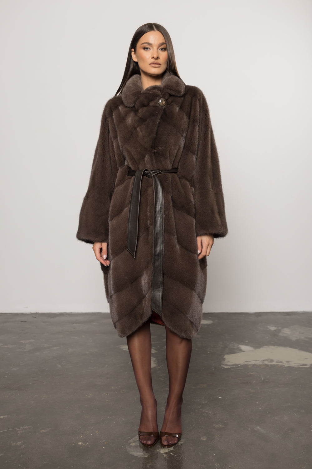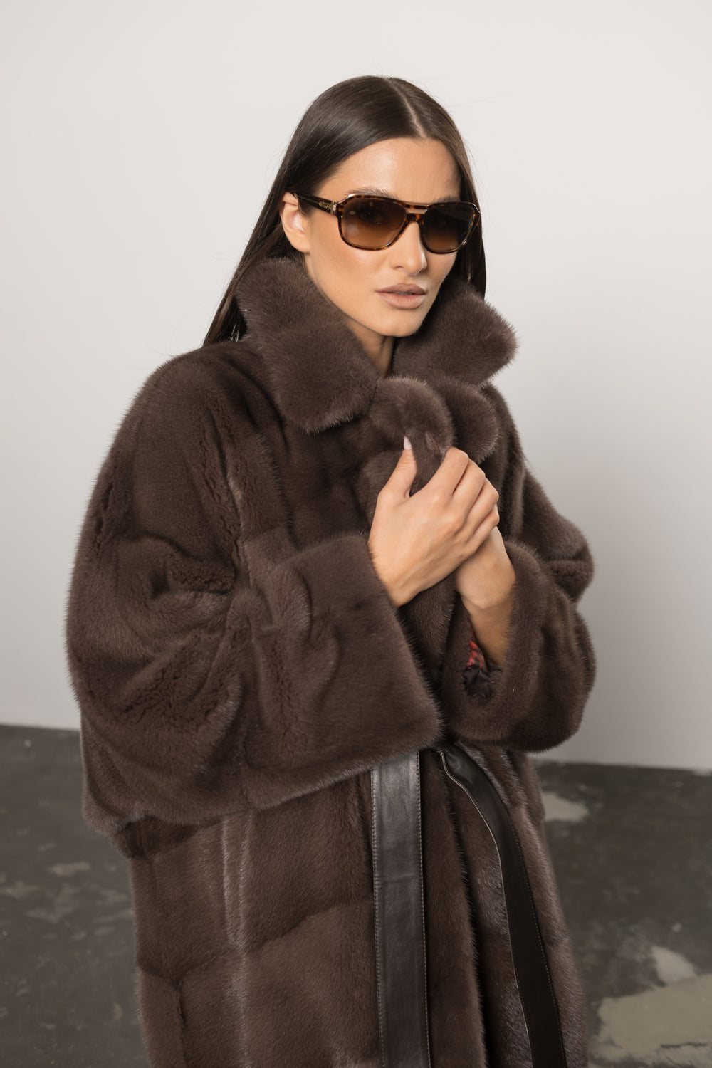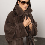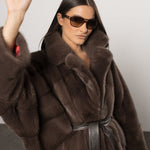 Palton din Blană Naturală de Vizon NAFA, cu Cordon din Piele, Cacao 425