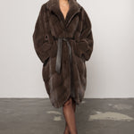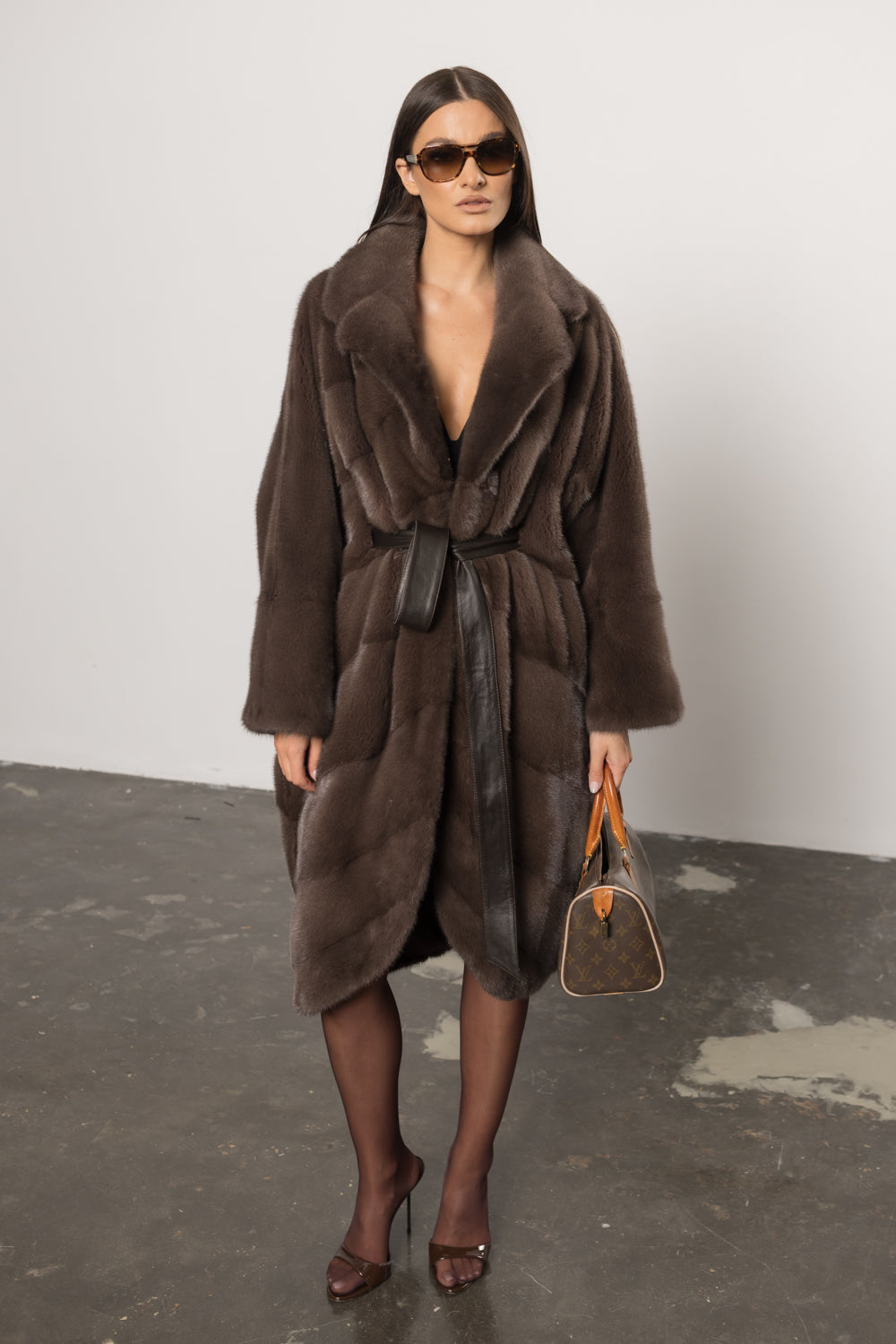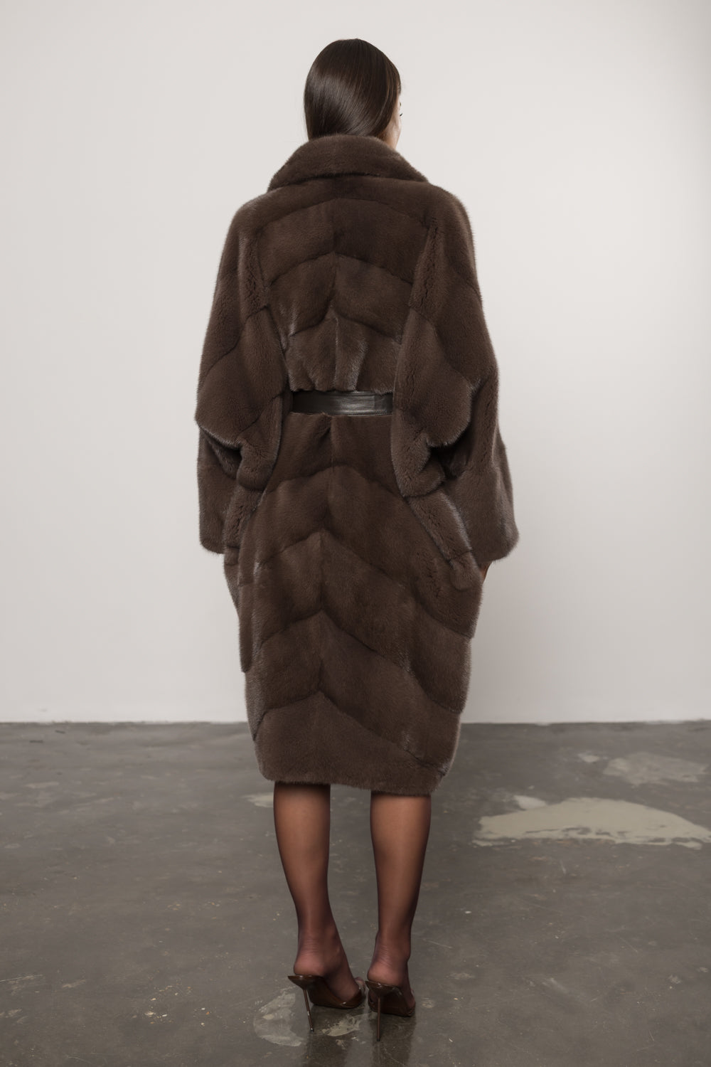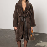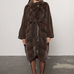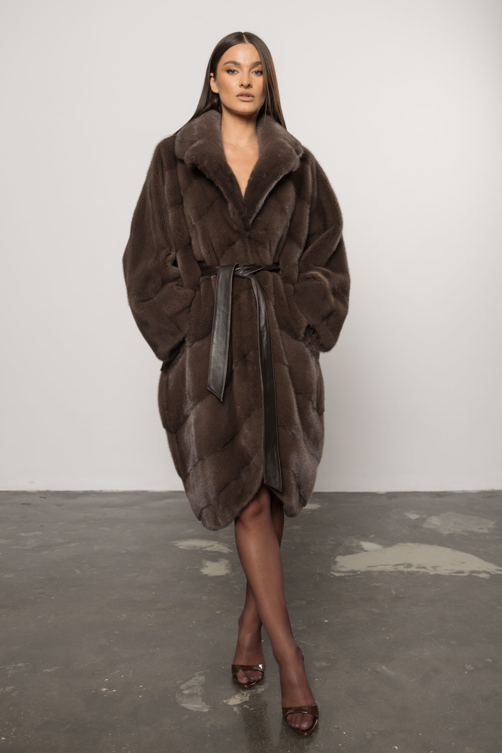 Palton din Blană Naturală de Vizon NAFA, cu Cordon din Piele, Cacao 425