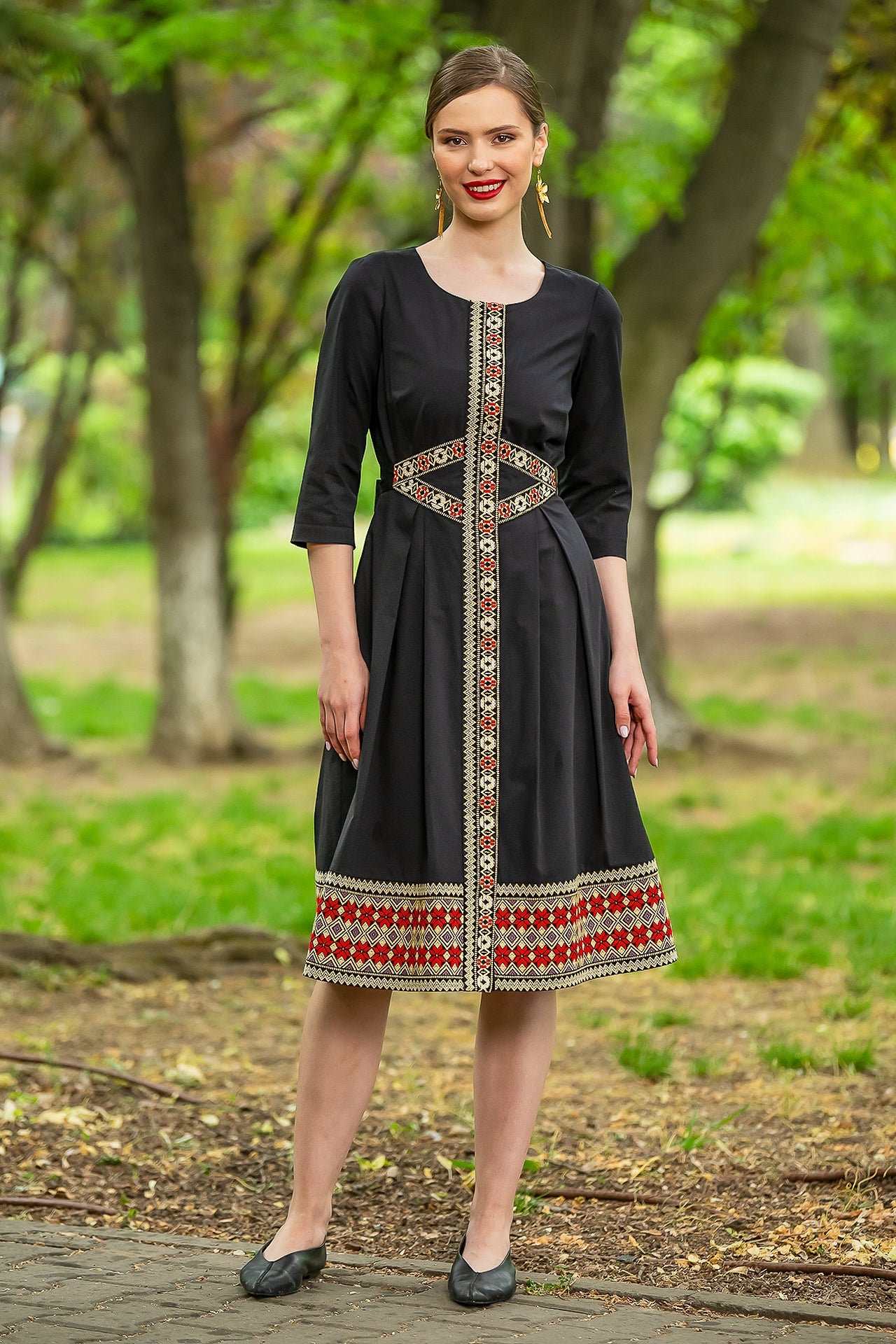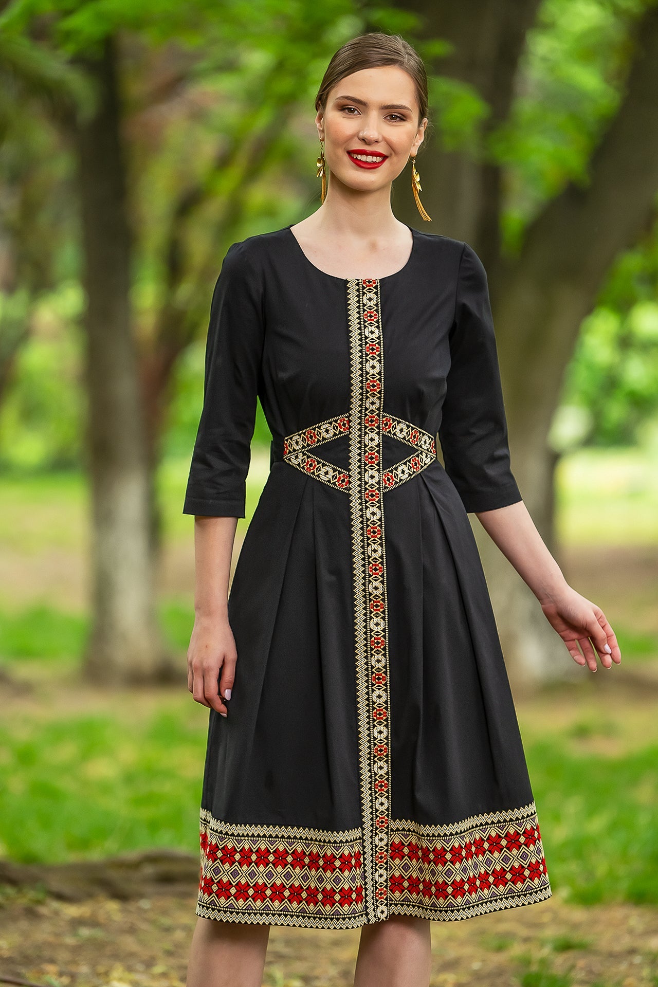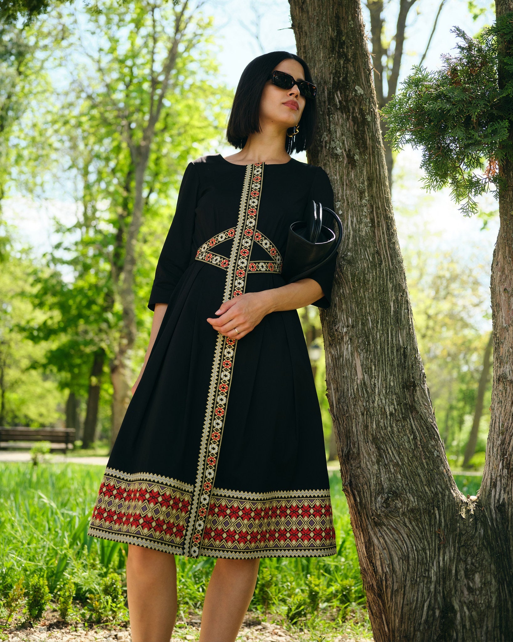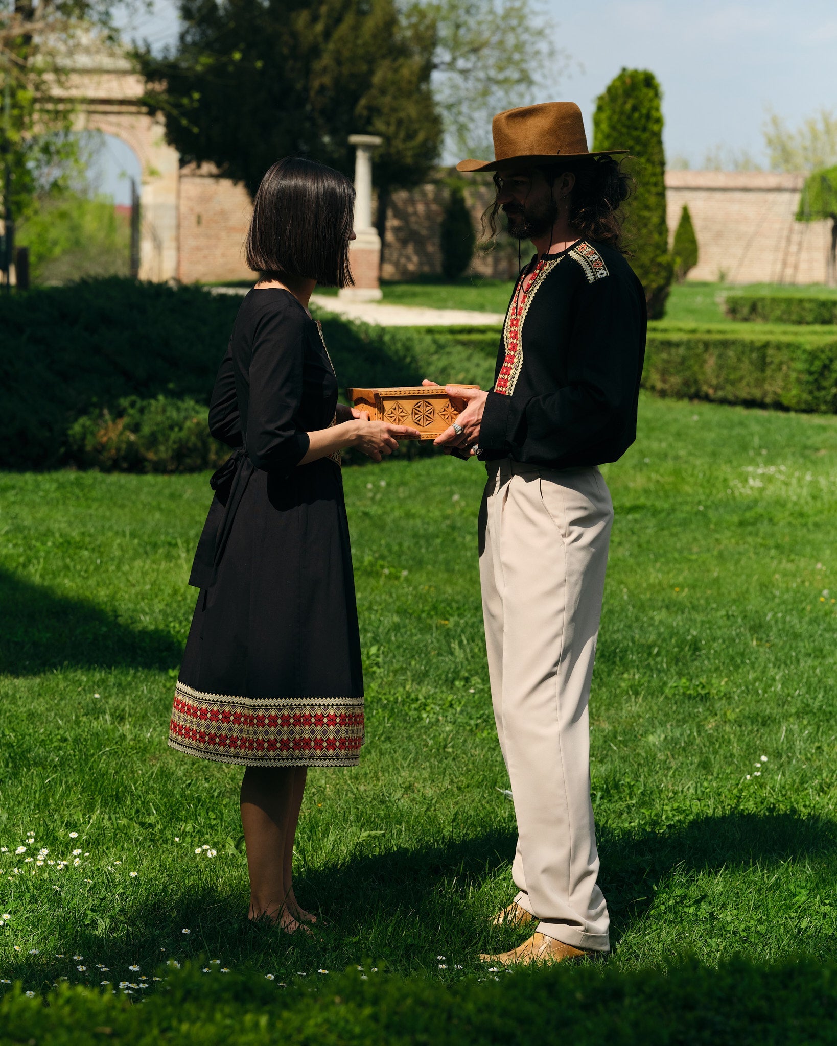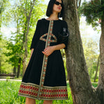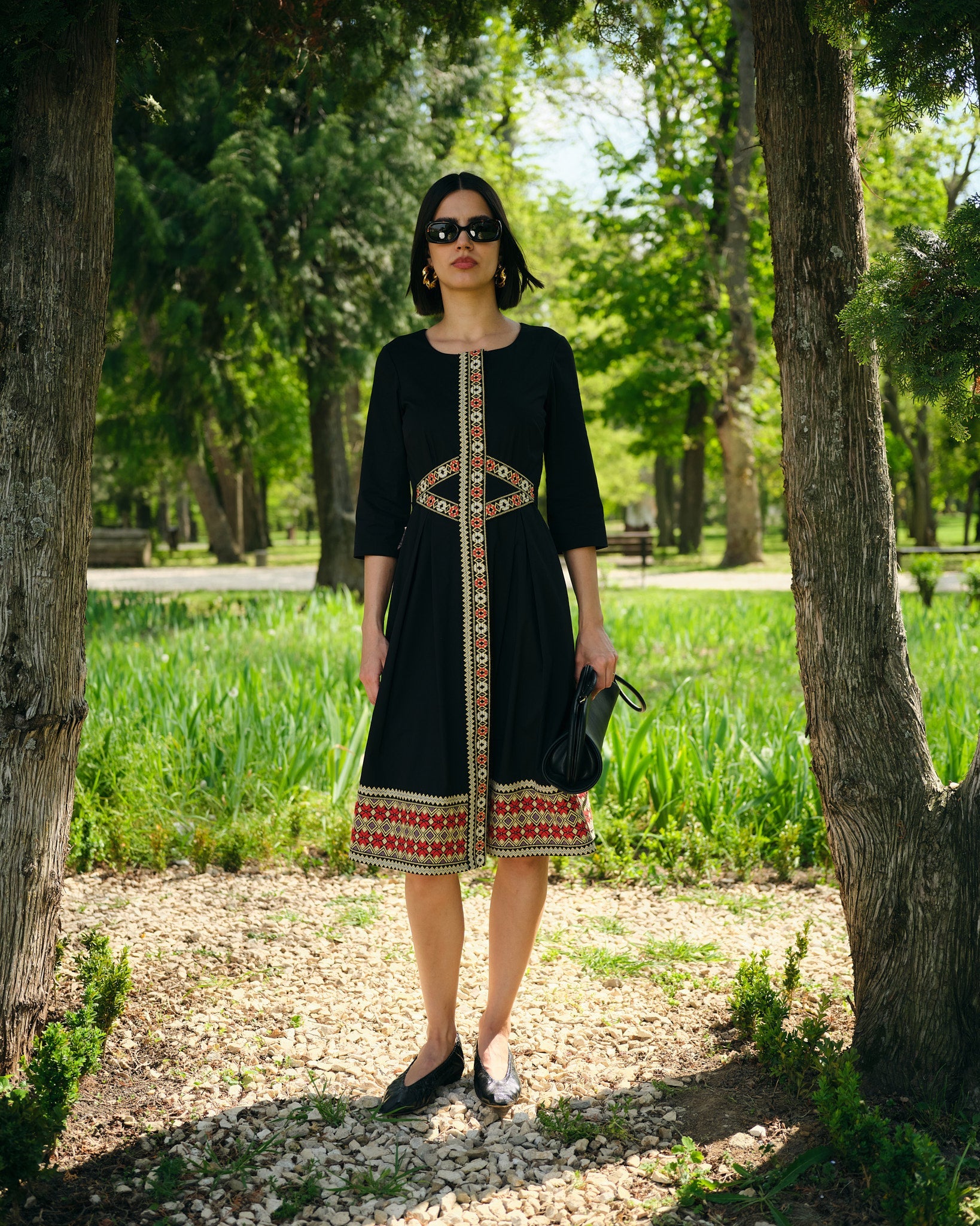 Rochia Despina are mâneca 3/4, se închide în față cu nasturi și fentă dublă cu motive tradiționale și se prinde cu cordon din jacquard în talie.