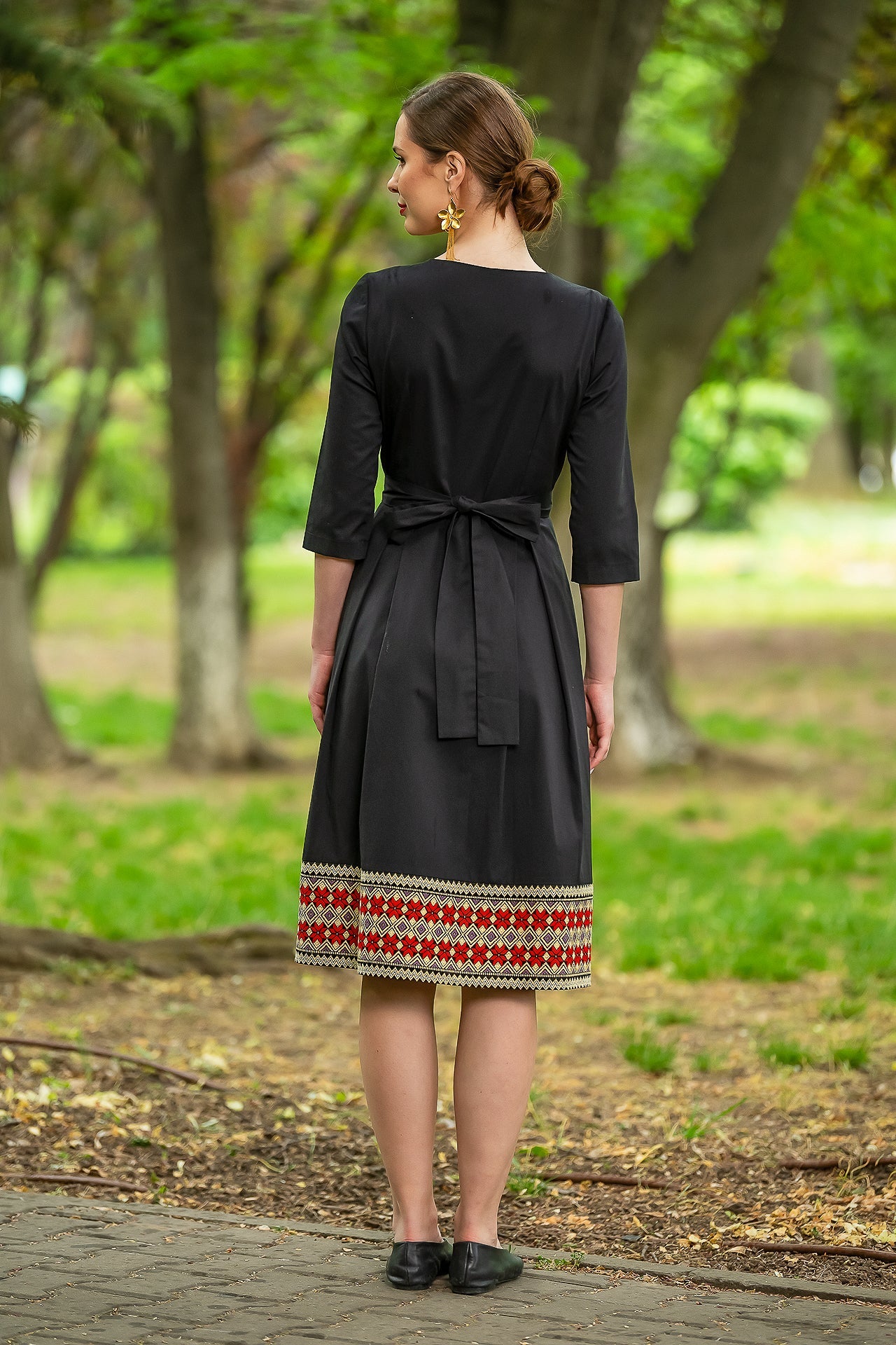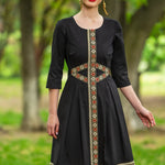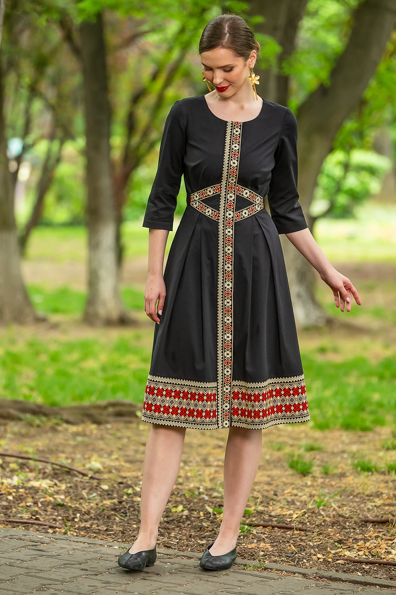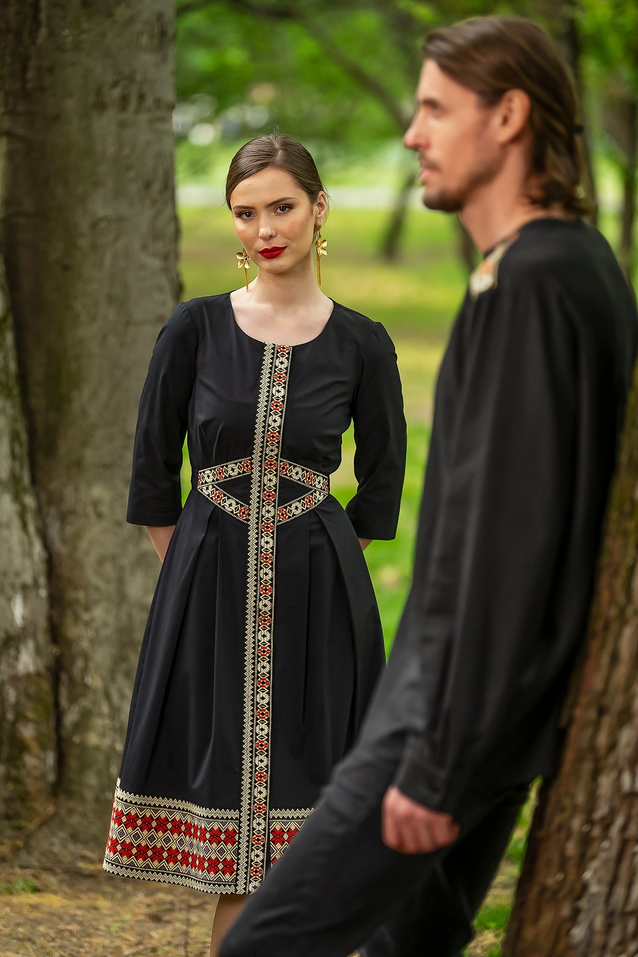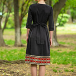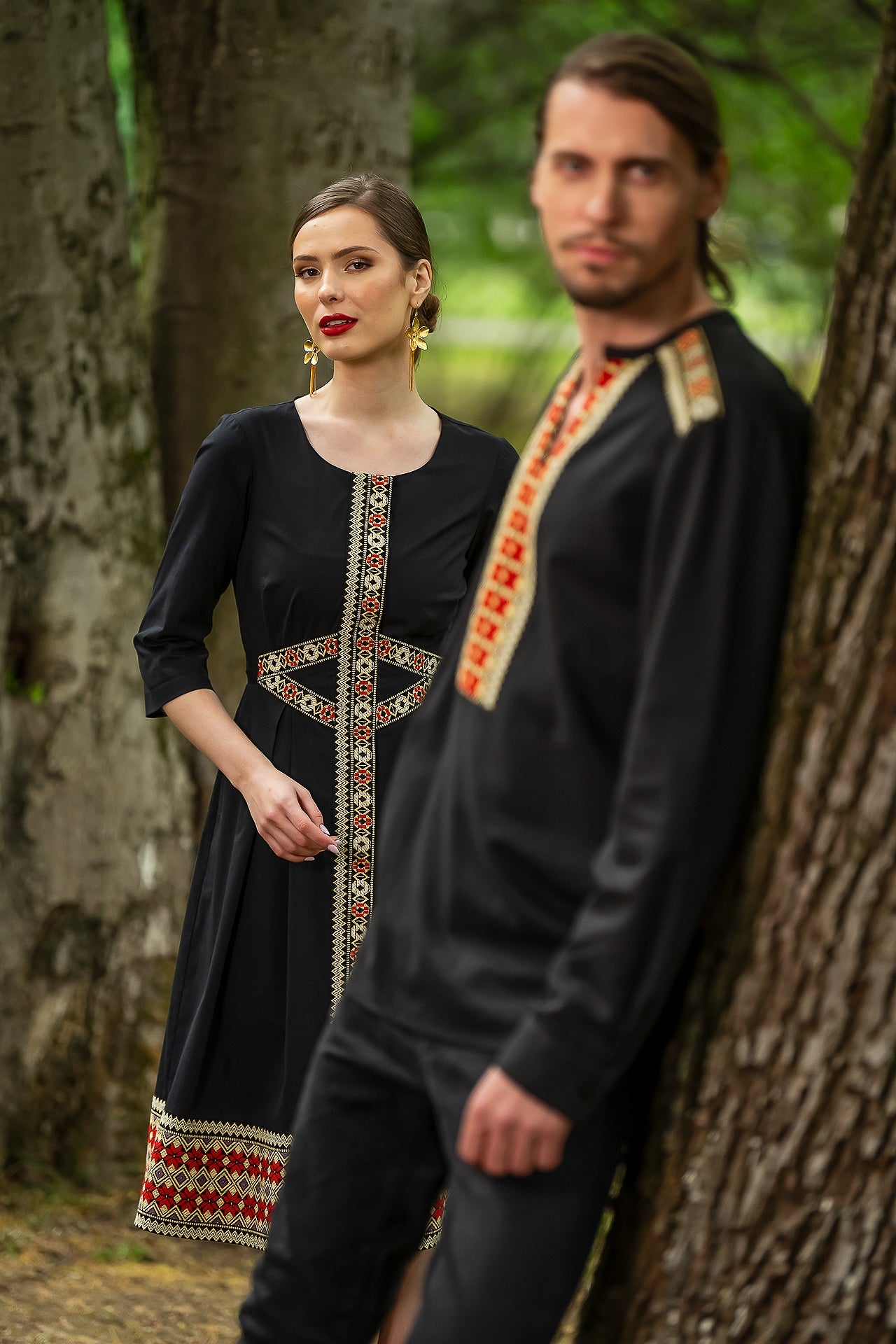 Rochia Despina are mâneca 3/4, se închide în față cu nasturi și fentă dublă cu motive tradiționale și se prinde cu cordon din jacquard în talie.