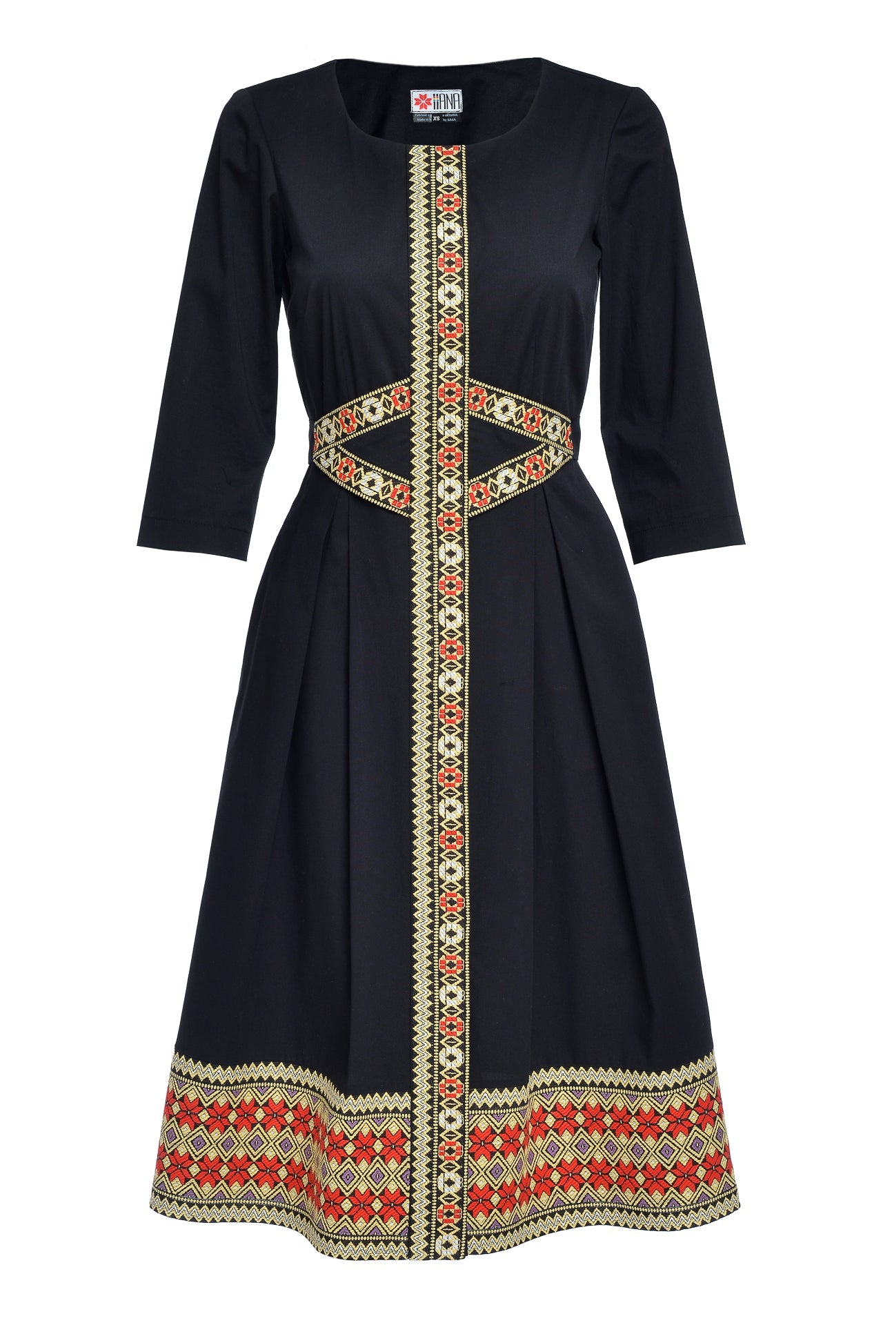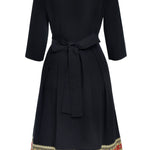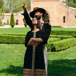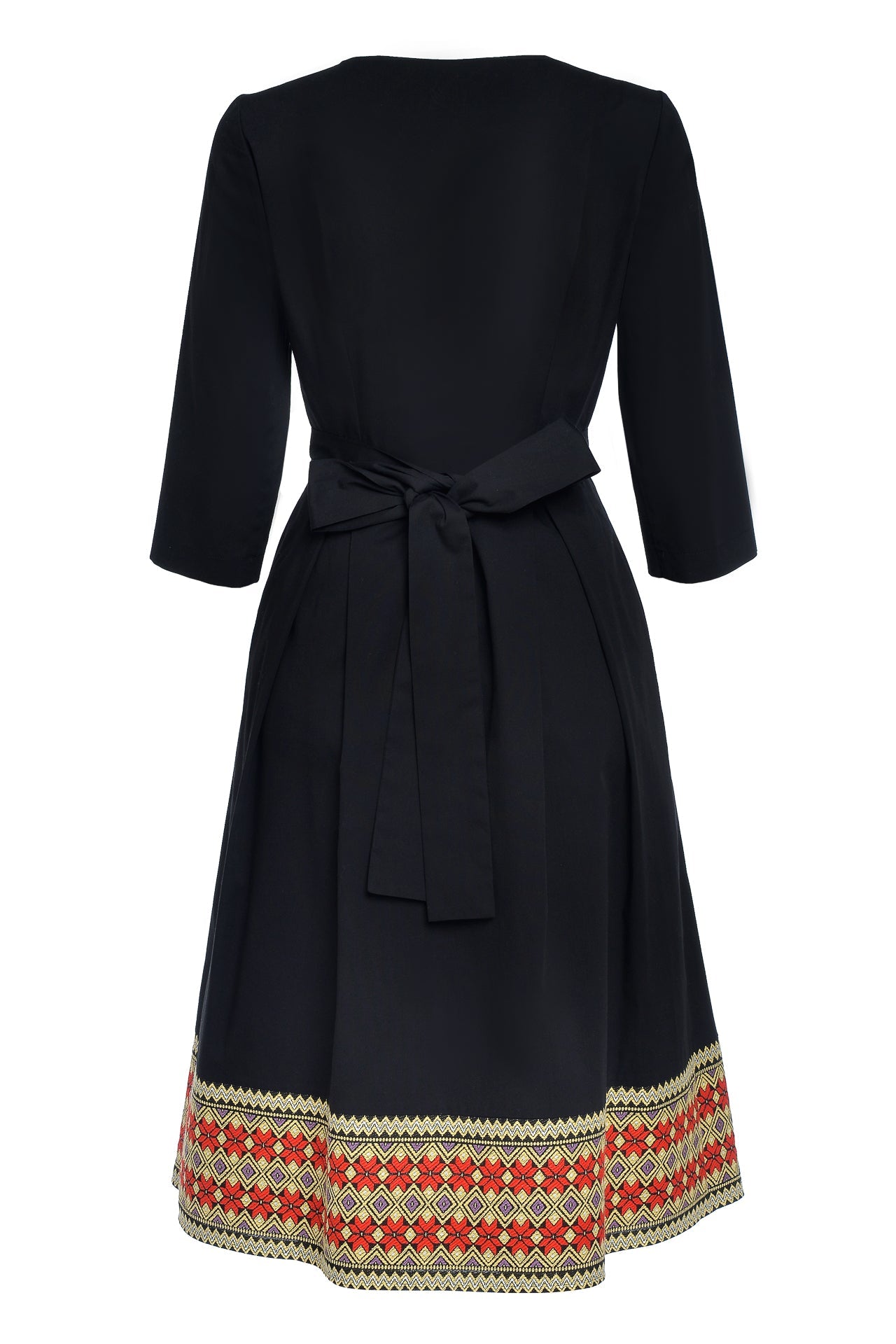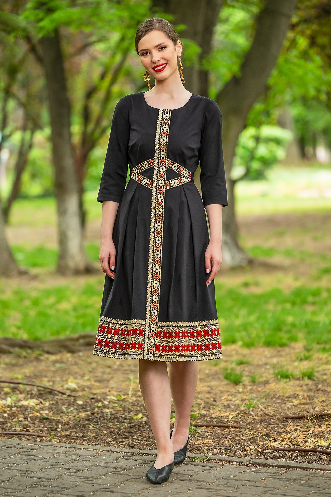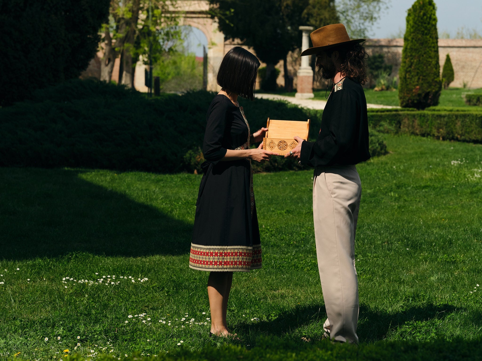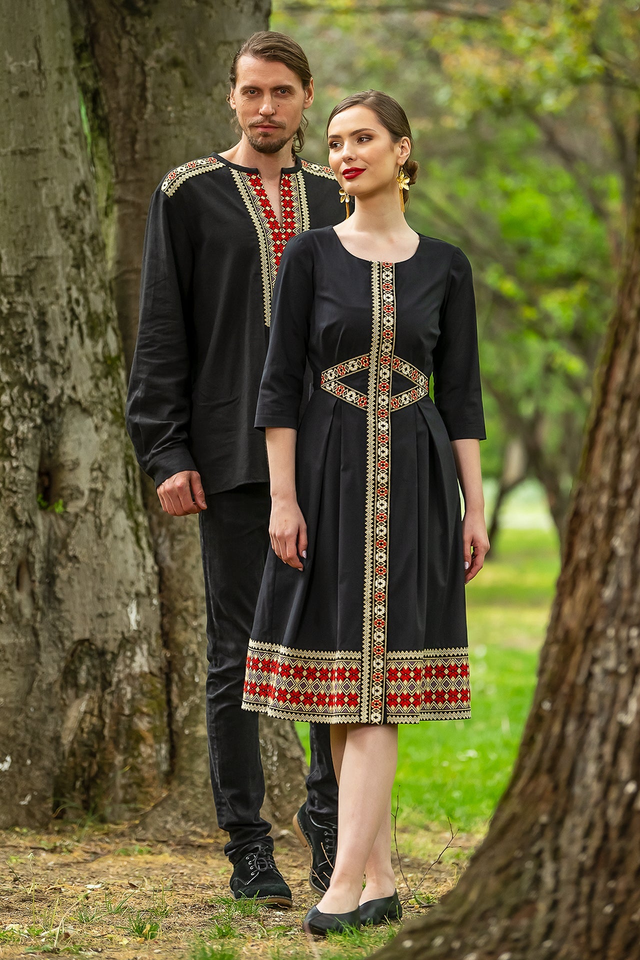 Rochia Despina are mâneca 3/4, se închide în față cu nasturi și fentă dublă cu motive tradiționale și se prinde cu cordon din jacquard în talie.