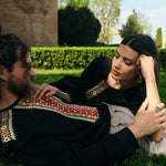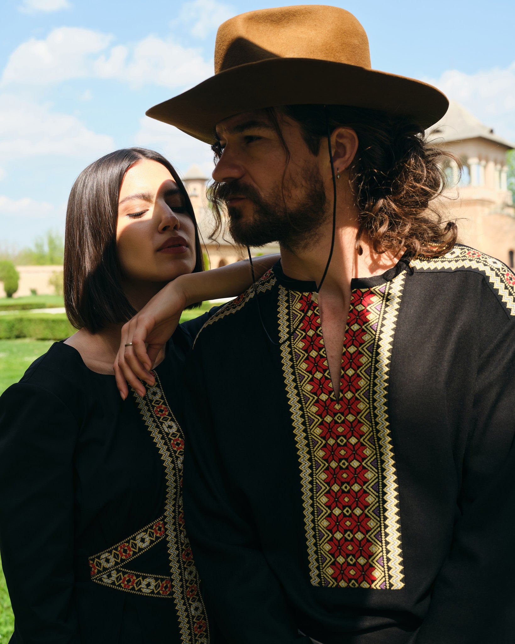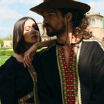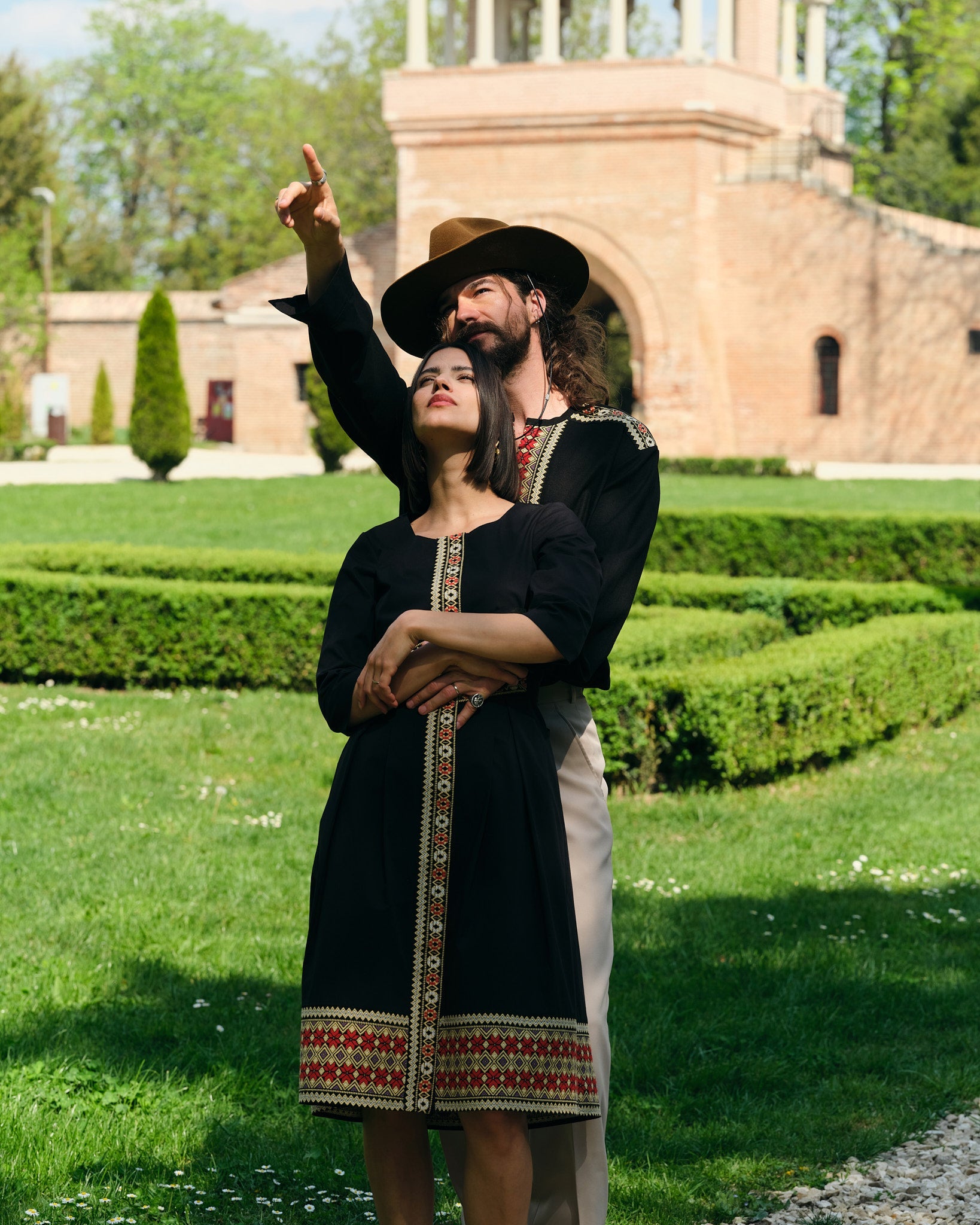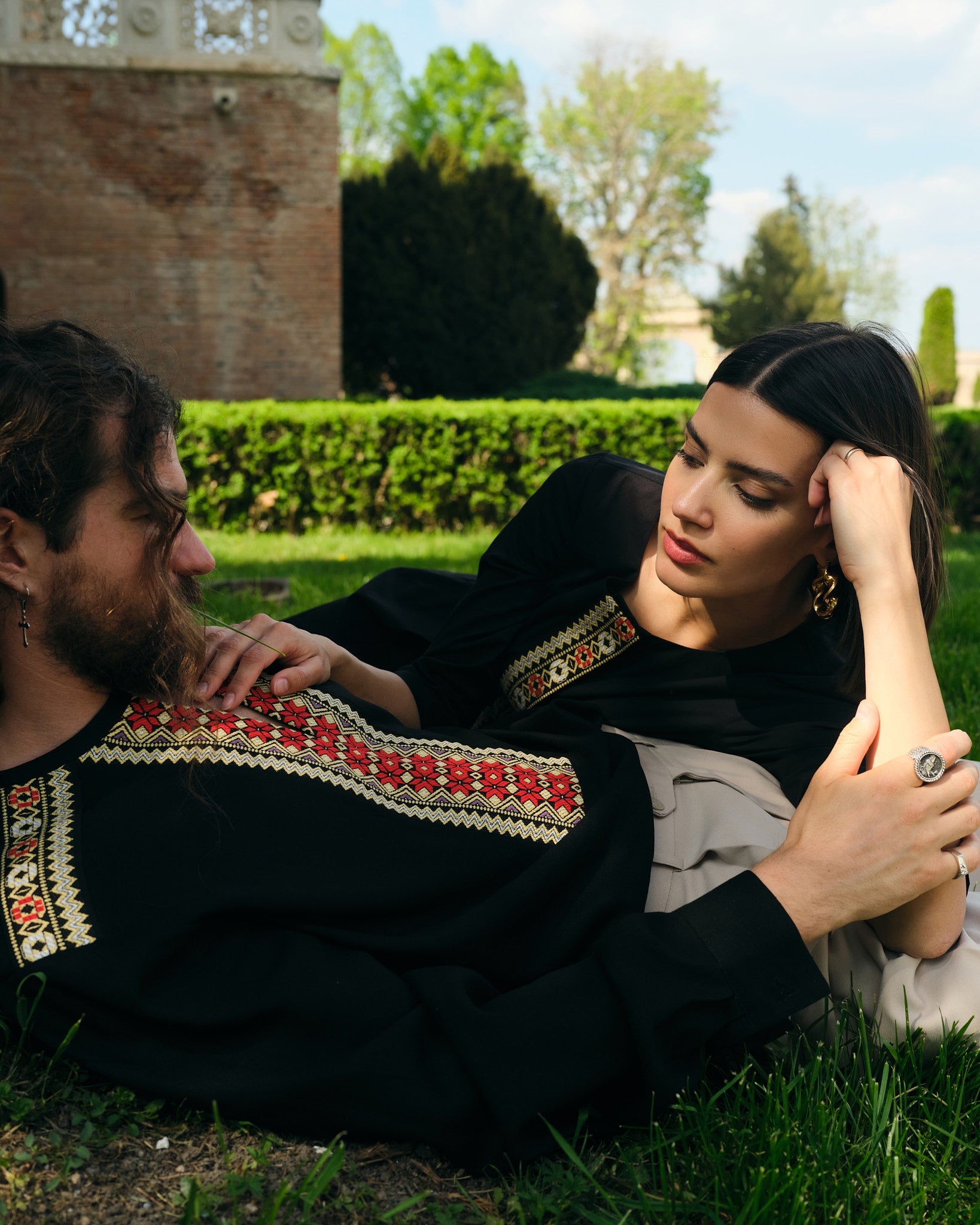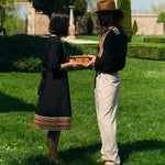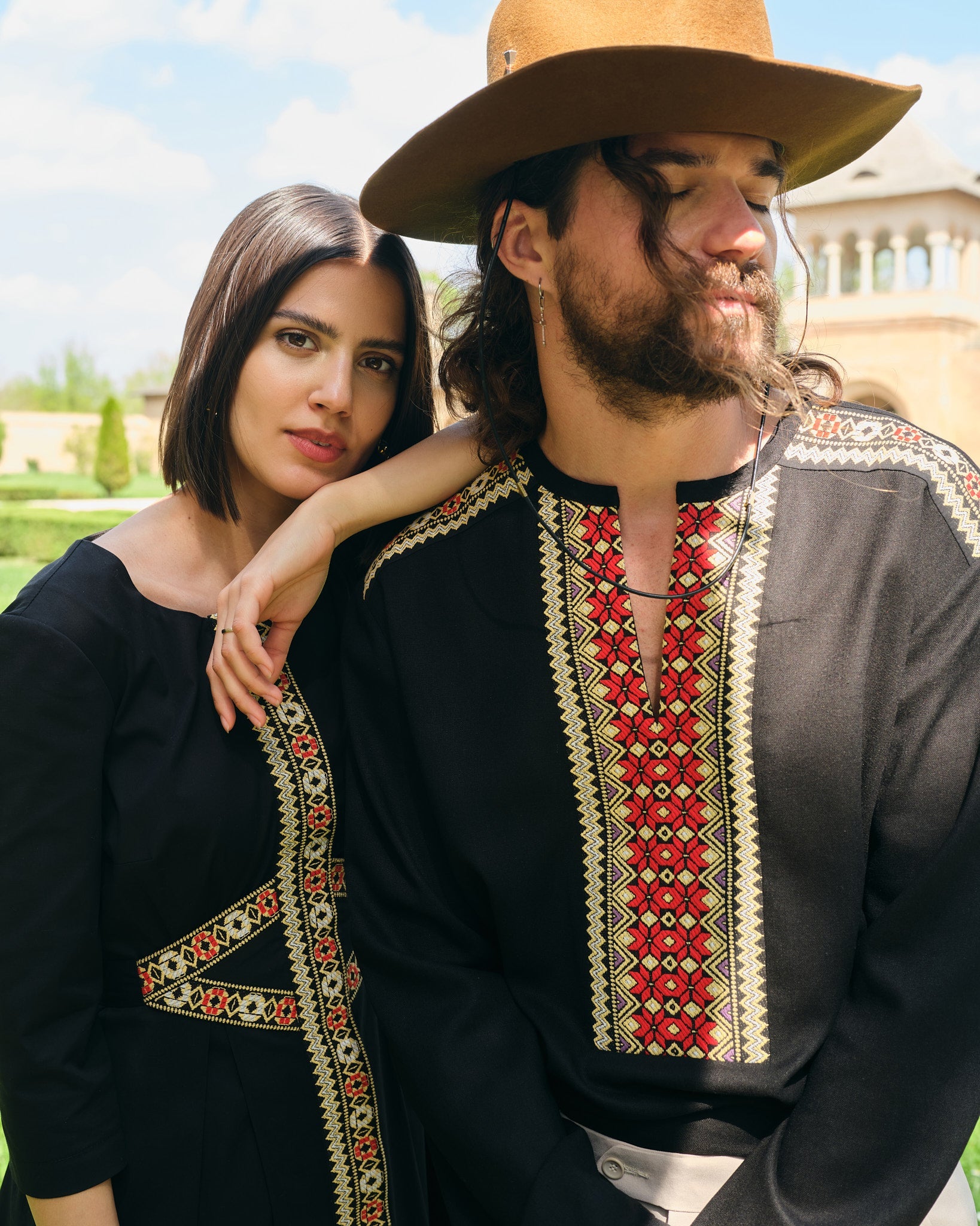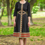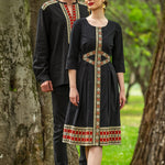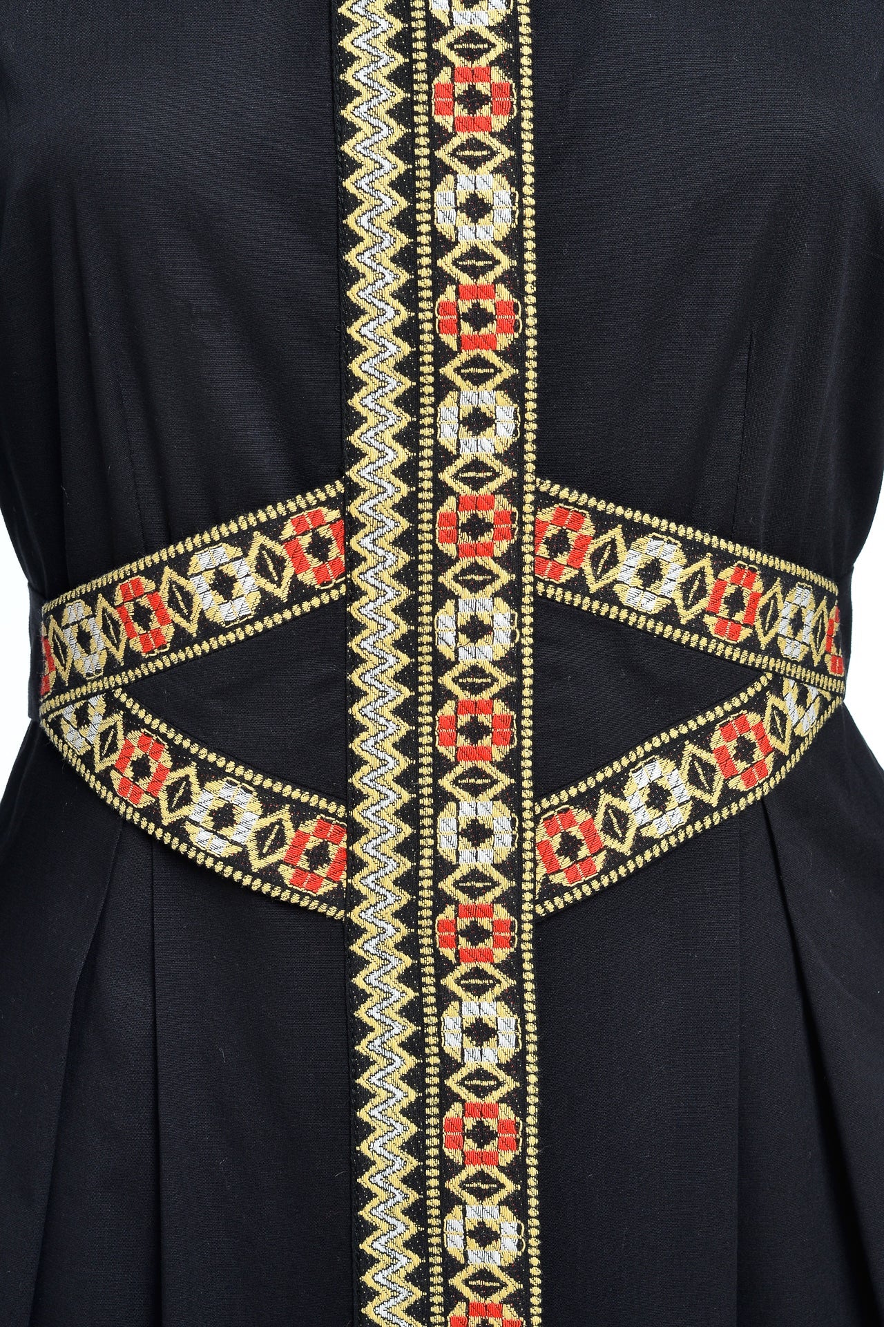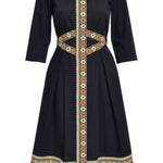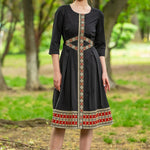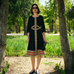 Rochia tip cămașă midi Despina este confecționată din bumbac cu elastan și jacquard etnic țesut în contextură (NU prin vopsire sau printarea materialului).