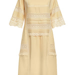 Rochia are un croi sofisticat dar lejer, cu mânecă chimono, înnobilată cu dantelă florală din bumbac.