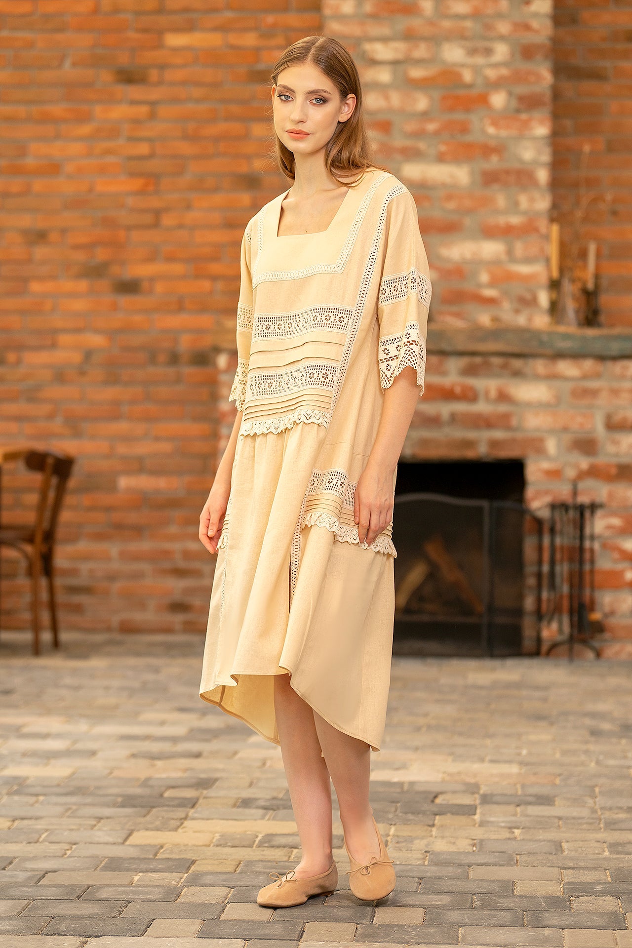 Rochia din in si dantelă tradițională este o piesă modernă care se adresează femeilor curajoase.